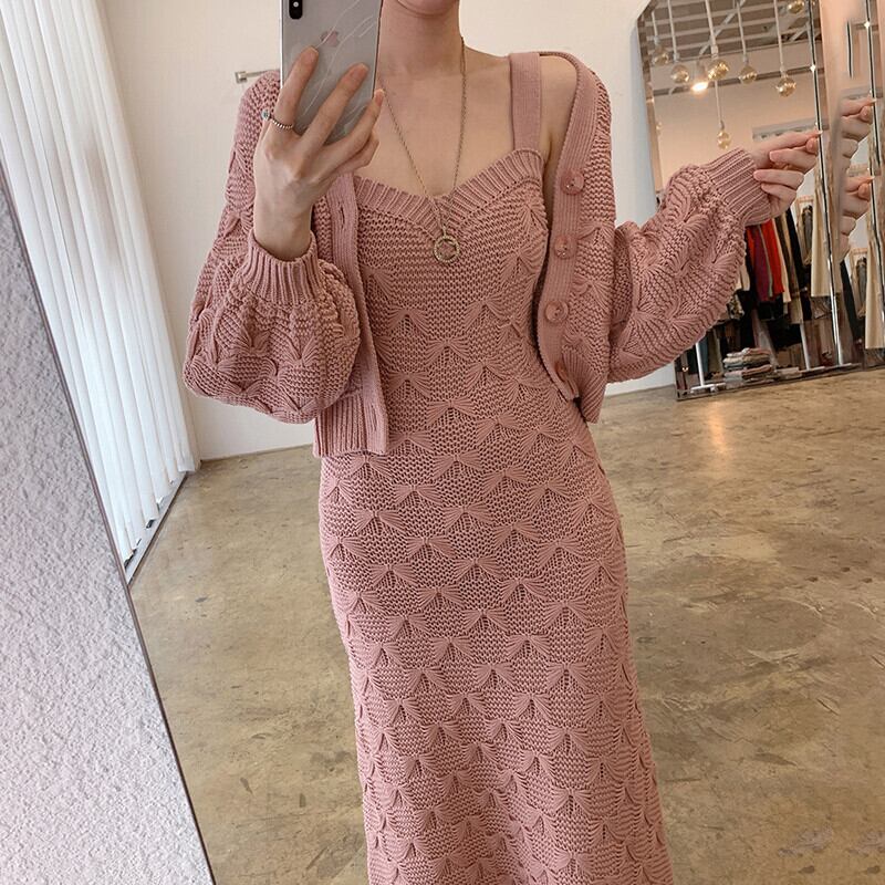 秋冬新作レディースフレンチレトロランタンスリーブニットカーディガンコートサスペンダーワンピースロングスカートツーピースセット オータム 秋物 ウィンター 冬物 yingd67939911733