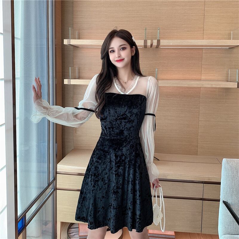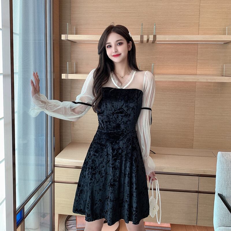 2020年秋新しいフレンチレトロ優しい風メッシュベルベットドレスウエストスリム気質リトルブラックドレス オータム 秋物 yingd43473713566