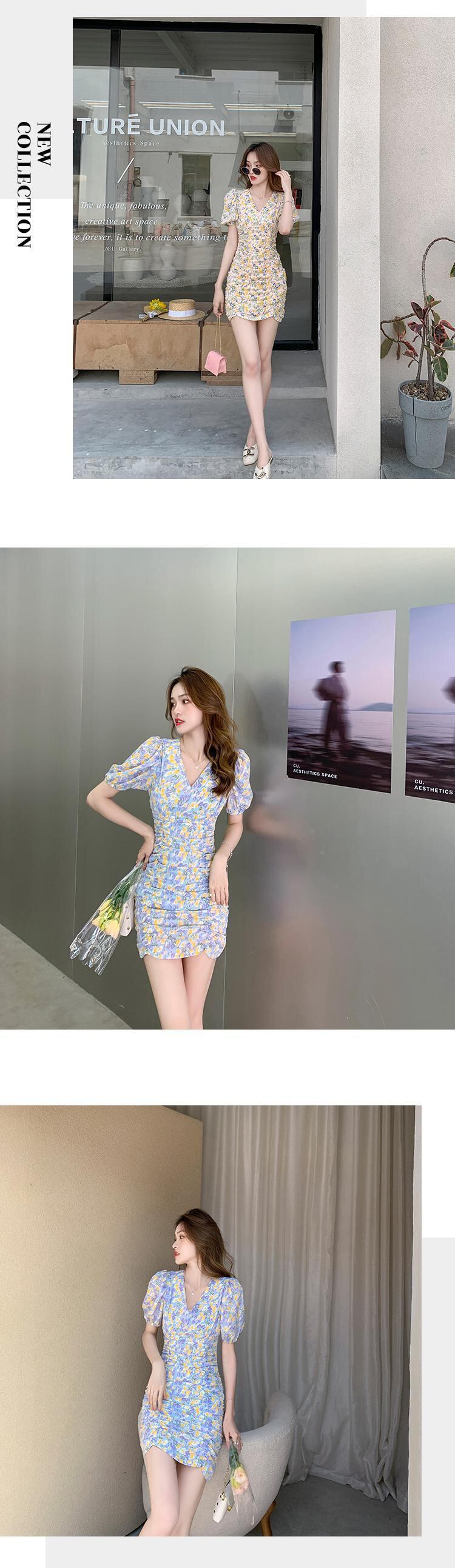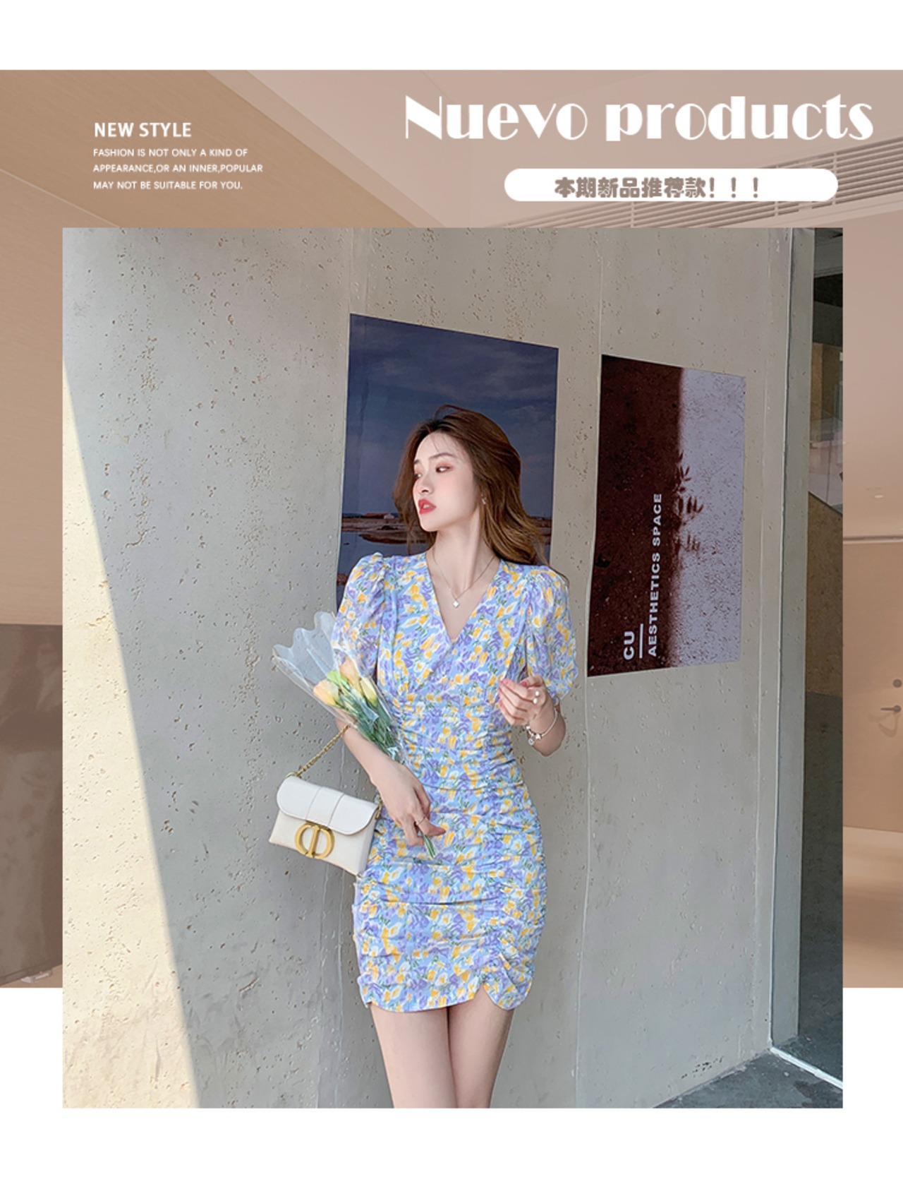 フレンチベルフラワーファーストラブスカートレトロジェントルVネックフローラルスカートセクシータイトヒップドレスサマーウエスト 夏物 花柄 フラワーデザイン yingd79355927338