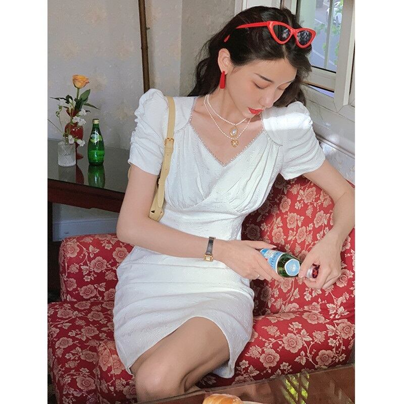 フランスのレトロなヘップバーンスタイルのロングドレスサマーライトラグジュアリーレディースセクシーなVネックパフスリーブウエストホワイトドレス女性の夏 夏物 yingd15643682852