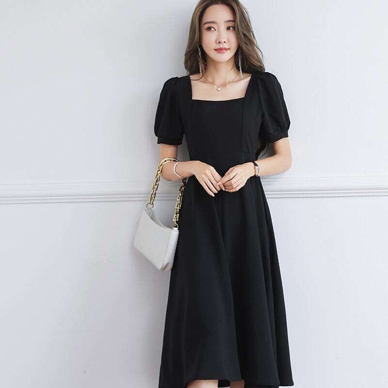 フランスのレトロなヘップバーンスタイルのロングドレス夏の気質の女神ファンYujie軽いおなじみのスタイルスクエアカラーパフスリーブドレス女性の夏 サマー 夏物 スクウェア yingd96759255757