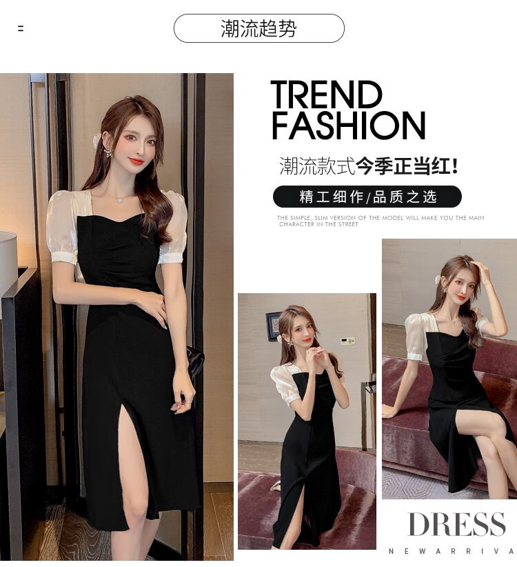 フレンチレトロヘップバーンスタイルリトルブラックドレスデザインセンス女神ファンゆうじえライトおなじみスタイルスクエアカラースリットドレス女性夏 サマー 夏物 スクウェア yingd35585879922