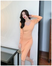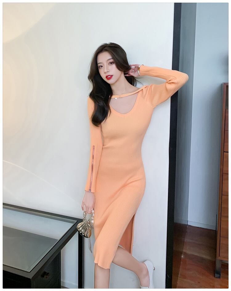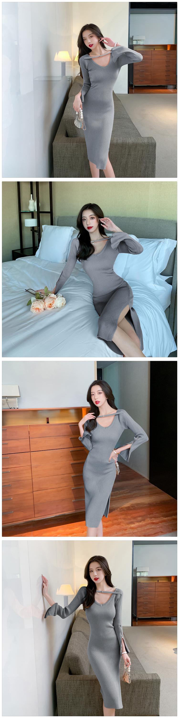 気質フェミニンなセータードレスミドル丈シックスリムフィットセクシーなスプリットニットドレス女性の秋と冬 オータム 秋物 ウィンター 冬物 yingd4505206167