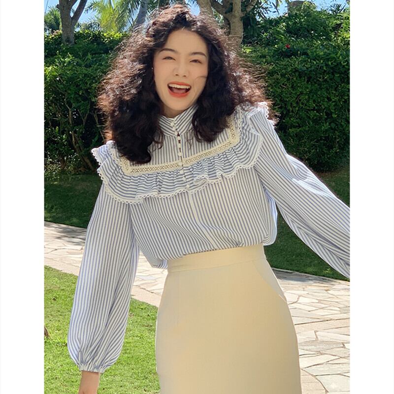 -品質トップの女性の2022年春の新しいデザインセンスのニッチな甘いレースの縞模様のスタンドアップカラーソルトシャツの女性 大人ガーリー スウィート キュート カジュアル スプリング 春物 ストライプ yingd77600991348