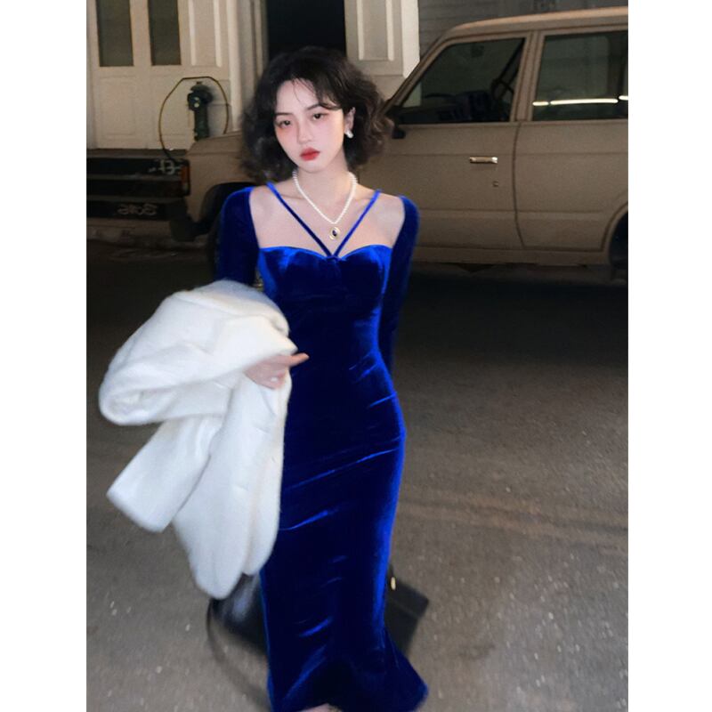 見事なスカート、ハイエンドセンス、ライトラグジュアリー、セレブリティデザインセンス、ロイヤルシスター、軽くて馴染みのあるスタイル、スクエアカラー、ホルターネック、ベルベットドレス、ウィンタースタイル 冬物 スカート スクウェア yingd38651222289