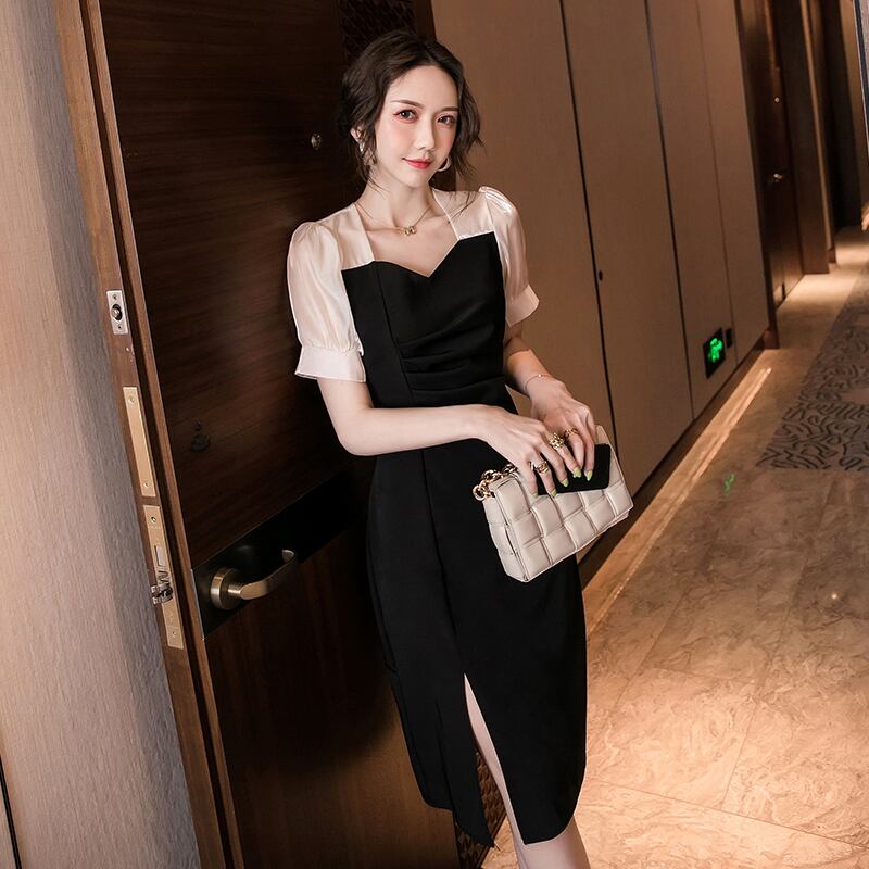 フランスのレトロな冷風女性のハイエンド気質ライトラグジュアリーレディースデザインセンススリットスリムドレス女性の夏 サマー 夏物 yingd87178054796