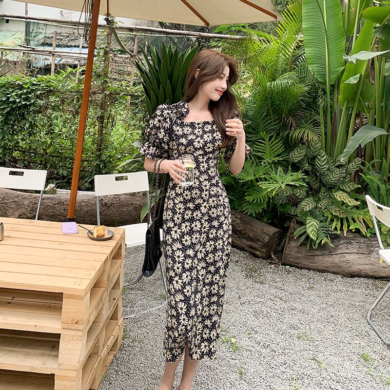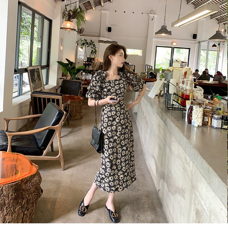 フレンチベルフラワーティーブレイクスカートスクエアネックパフスリーブフローラルロングスカート 花柄 フラワーデザイン スクウェア yingd97145091754
