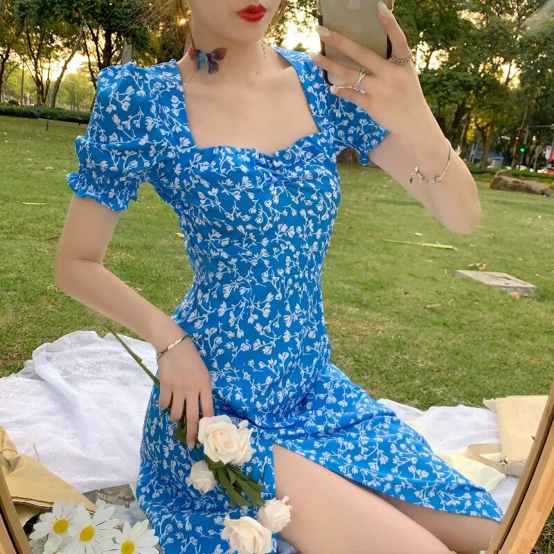 サマードレス2021新しいフレンチレトロウエストウエスト細い気質セクシーな軽いおなじみのスタイルスプリットシフォンフローラルドレス 夏物 花柄 yingd77763318722