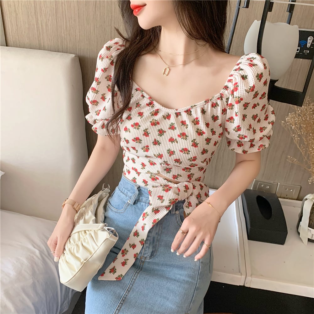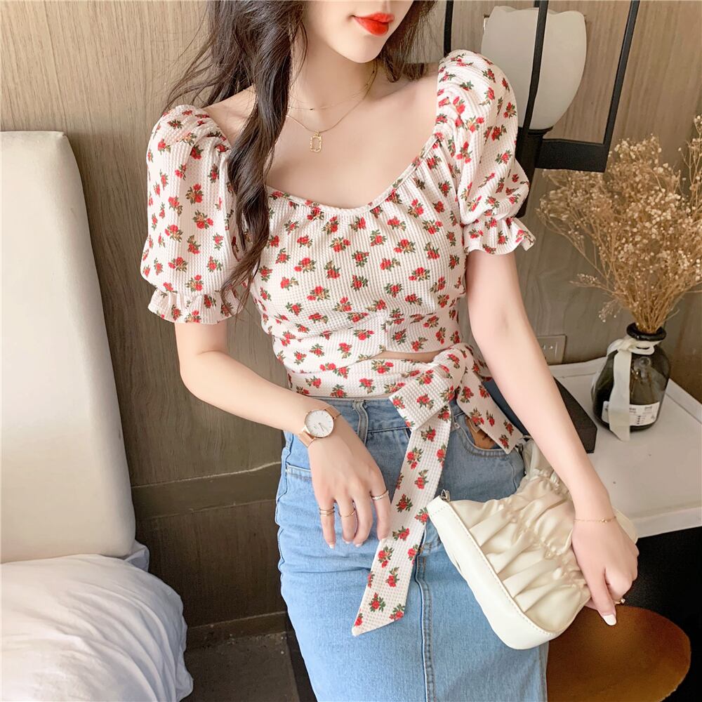 ショートトップの女性の2021年夏の新しいフレンチスクエアネックパフスリーブ露出鎖骨フローラルシャツ女性のデザインセンスは小さいです サマー 夏物 花柄 スクウェア yingd44610473555