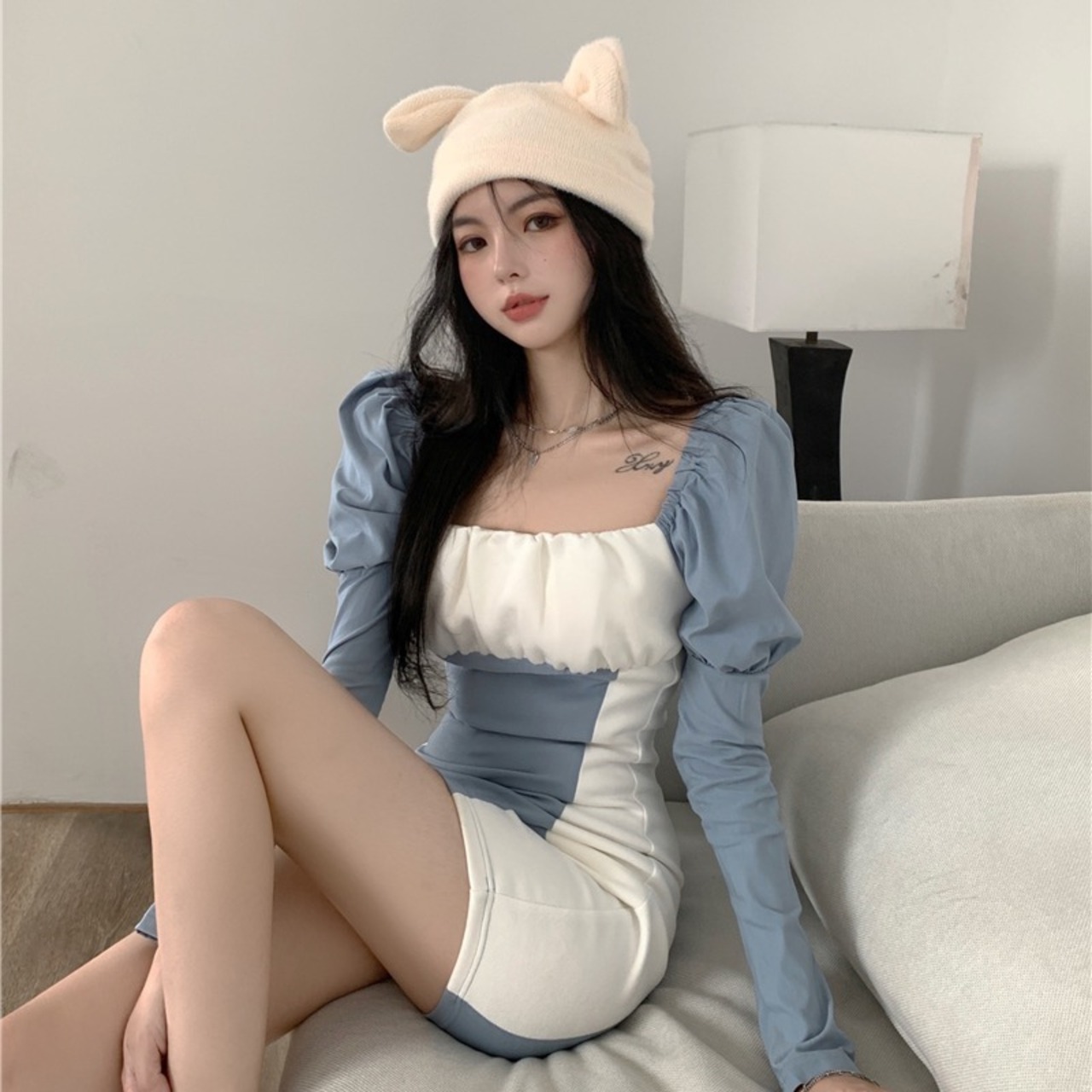 フレンチパフスリーブ、スクエアネック、タイトなラッピングヒップ、見事なショートスカート、シックなデザイン、ニッチ、純粋な欲望、ドレス、女性の春 スプリング 春物 ピュア スクウェア yingd79942763090