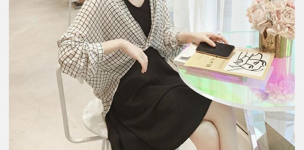 ショートスーツ女性2019夏新バージョンルーズチェック柄日焼け止めカーディガンサスペンダードレスツーピース サマー 夏物 yingd47583988014