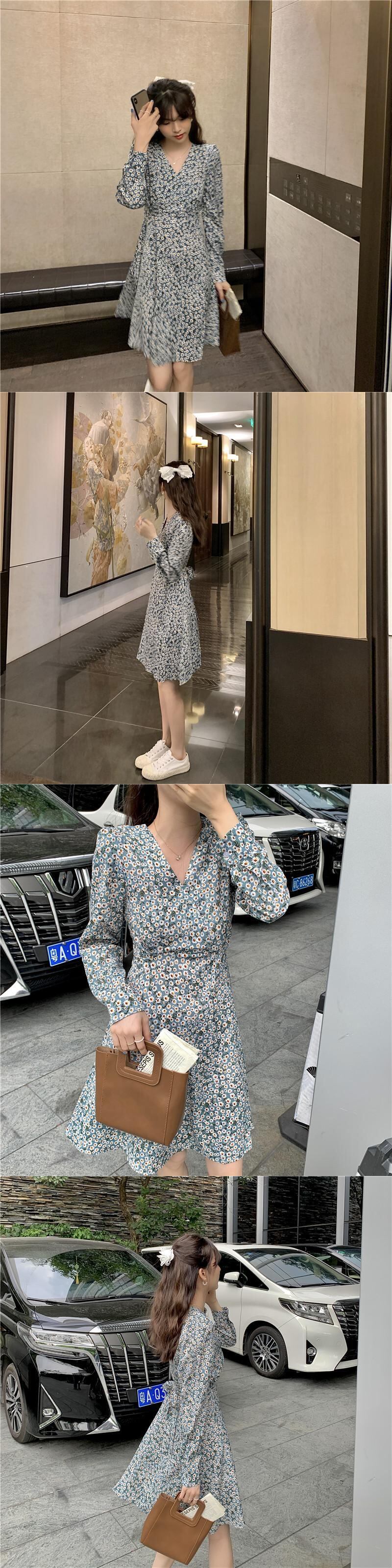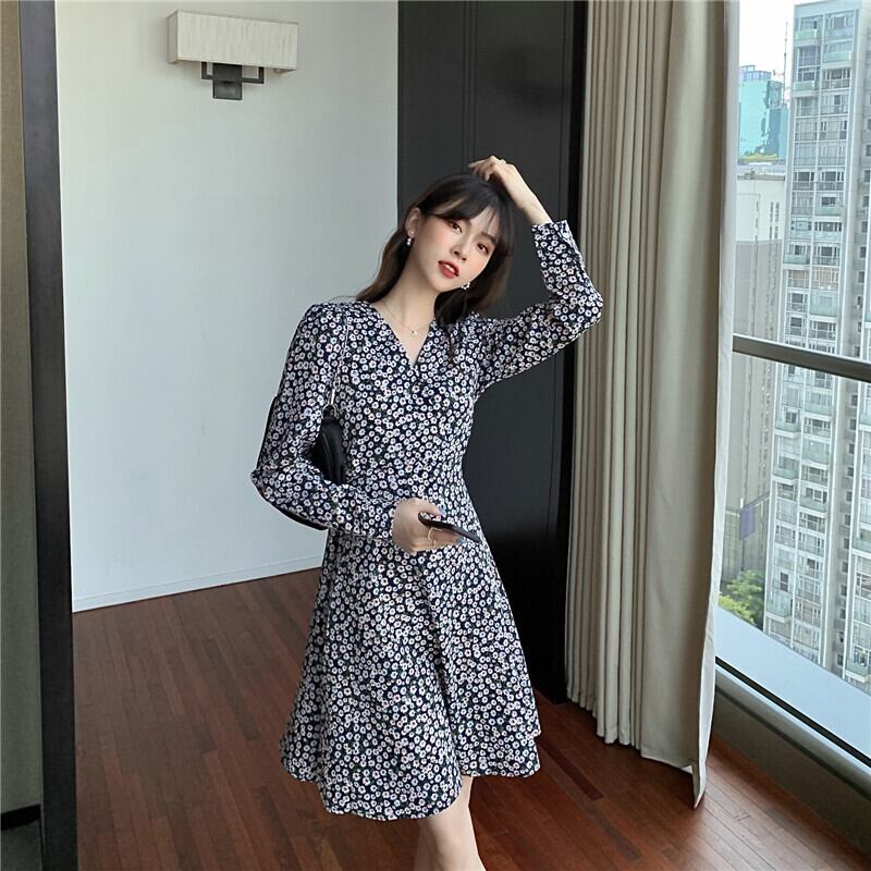 2021年春の新作フレンチレトロウエストウエスト薄手の気質優しい風長袖シフォンフローラルドレス女性 ロング スプリング 春物 花柄 yingd95467125005