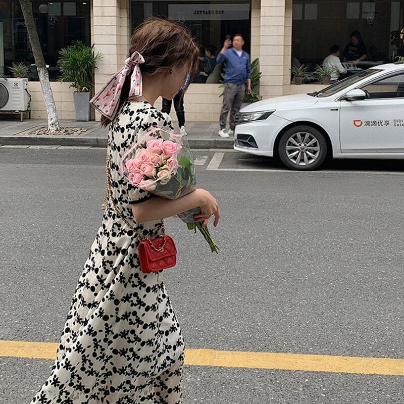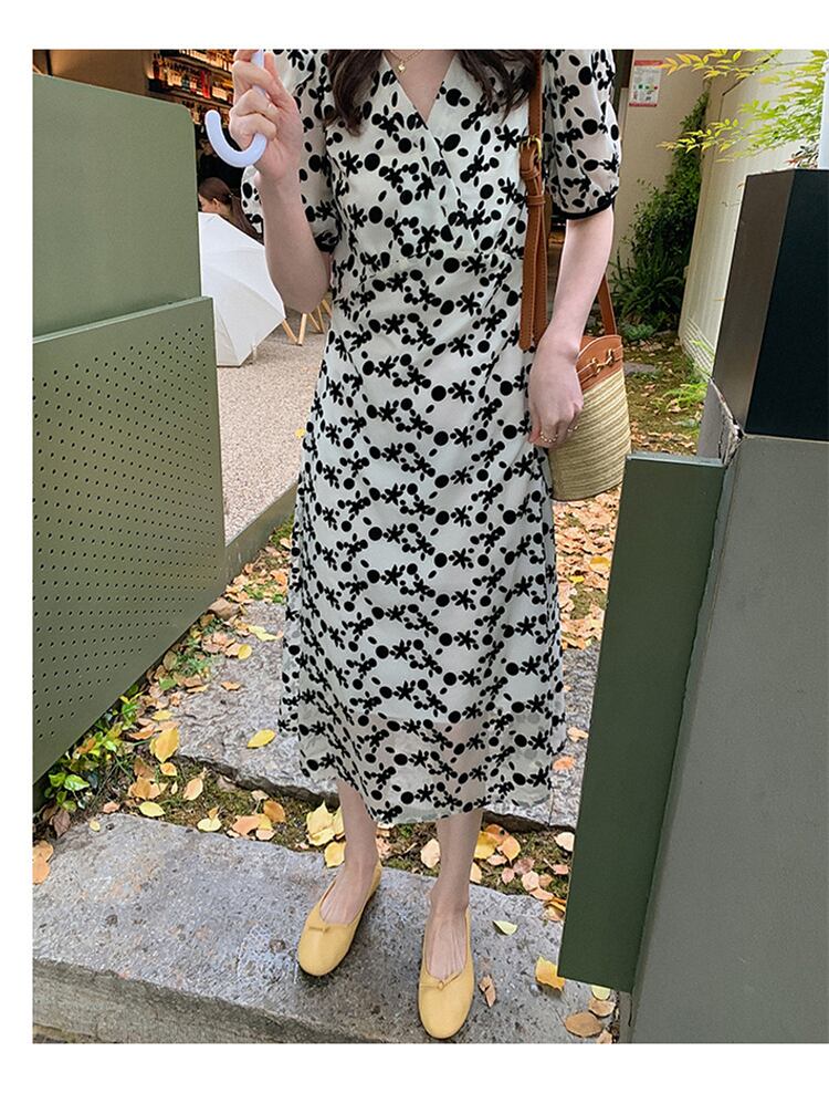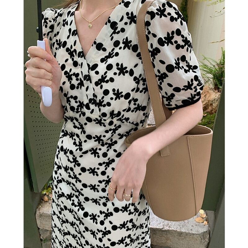 優しい風初恋フローラルフェアリースカートスーパーフェアリーセン部門ウエスト細いVネックパフスリーブフローラルドレス夏 サマー 夏物 花柄 yingd91295667134