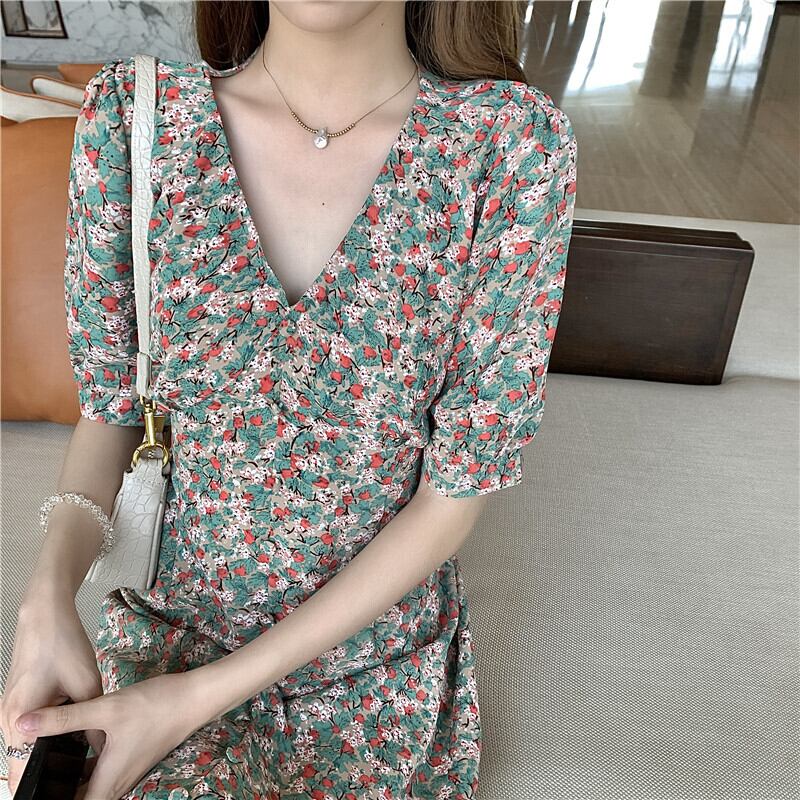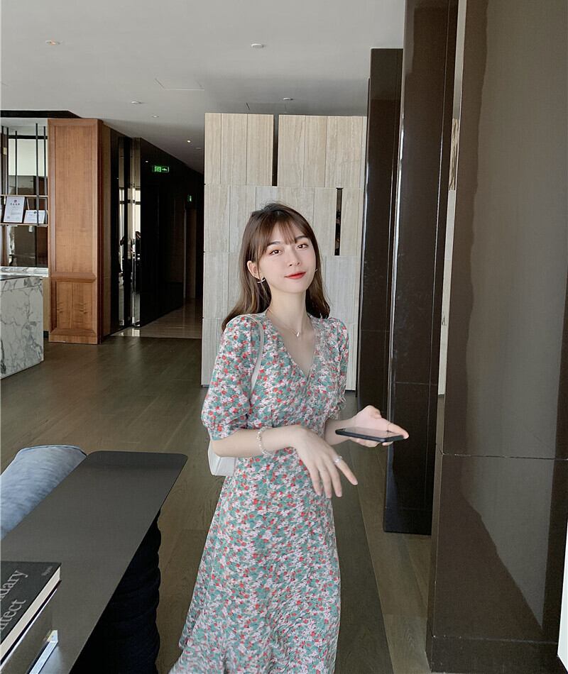 フレンチニッチベルフラワーティーブレイクドレスウエストスリミング気質Vネックスモールフローラルドレスレディースサマードレス2021new 夏物 花柄 フラワーデザイン yingd90759766357