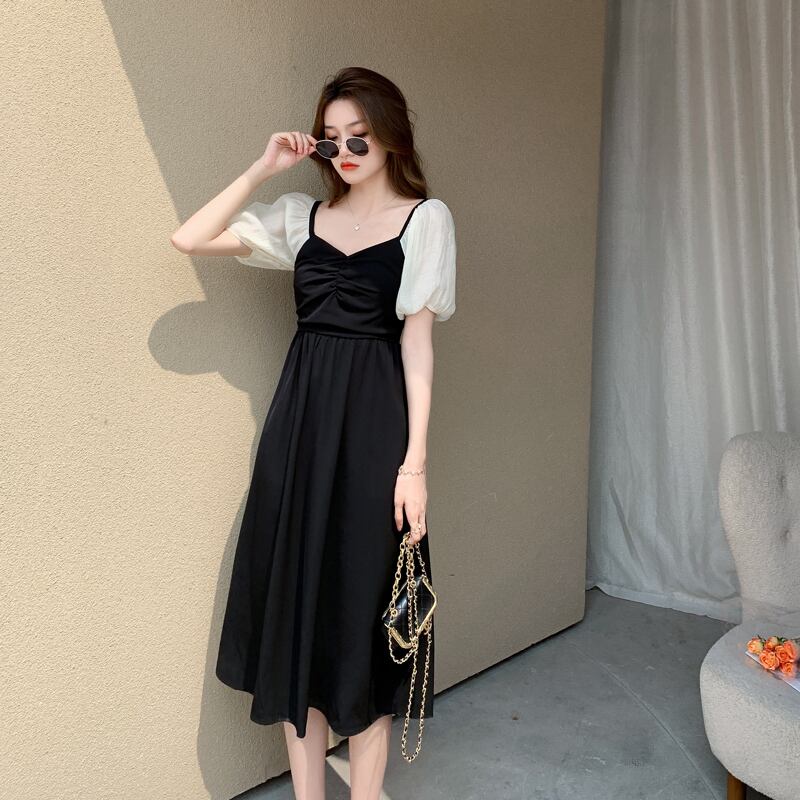 フランスのレトロなヘップバーンドレス夏のウエストスリム気質セクシーな背中の開いたスクエアネックパフスリーブドレス女性の夏 サマー 夏物 スクウェア yingd80059147602