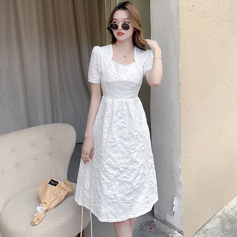 フレンチレトロヘップバーンスタイルのウエストと薄い気質のライトラグジュアリーレディースハイエンドスクエアカラードレス女性の夏のリトルブラックドレス サマー 夏物 スクウェア yingd22767125846