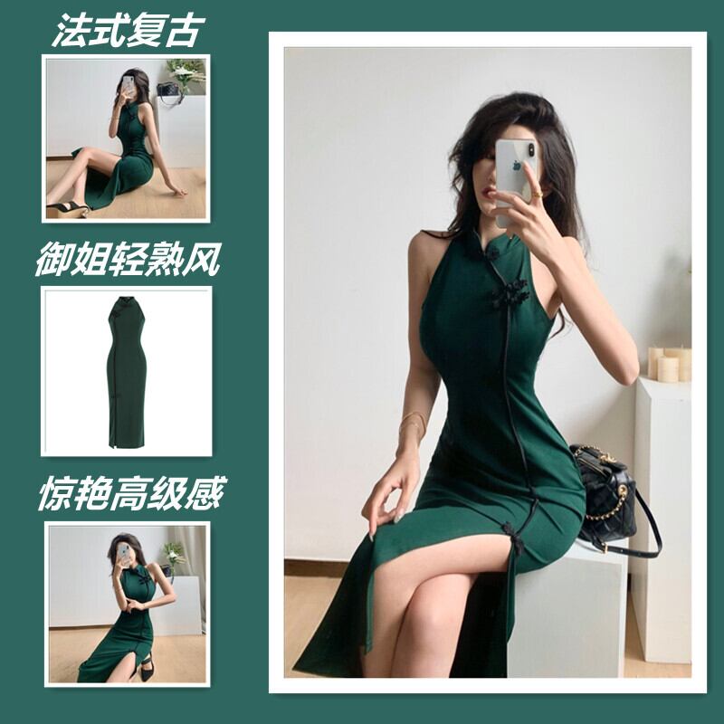 レトロな緑のチャイナドレスは、女性のスリムなスリムな気質を改善しましたロイヤルシスターライトおなじみのスタイル見事なセクシーなスプリットドレスの女性 グリーン yingd37663925089