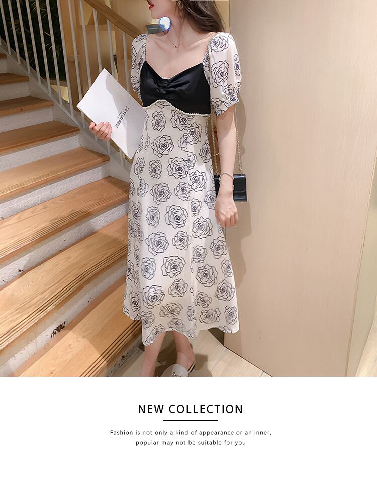 フランスのレトロなヘップバーンスタイルのスクエアネックパフスリーブローズドレスデザインセンスニッチスリムウエストドレス女性の夏 サマー 夏物 スクウェア yingd26805010678