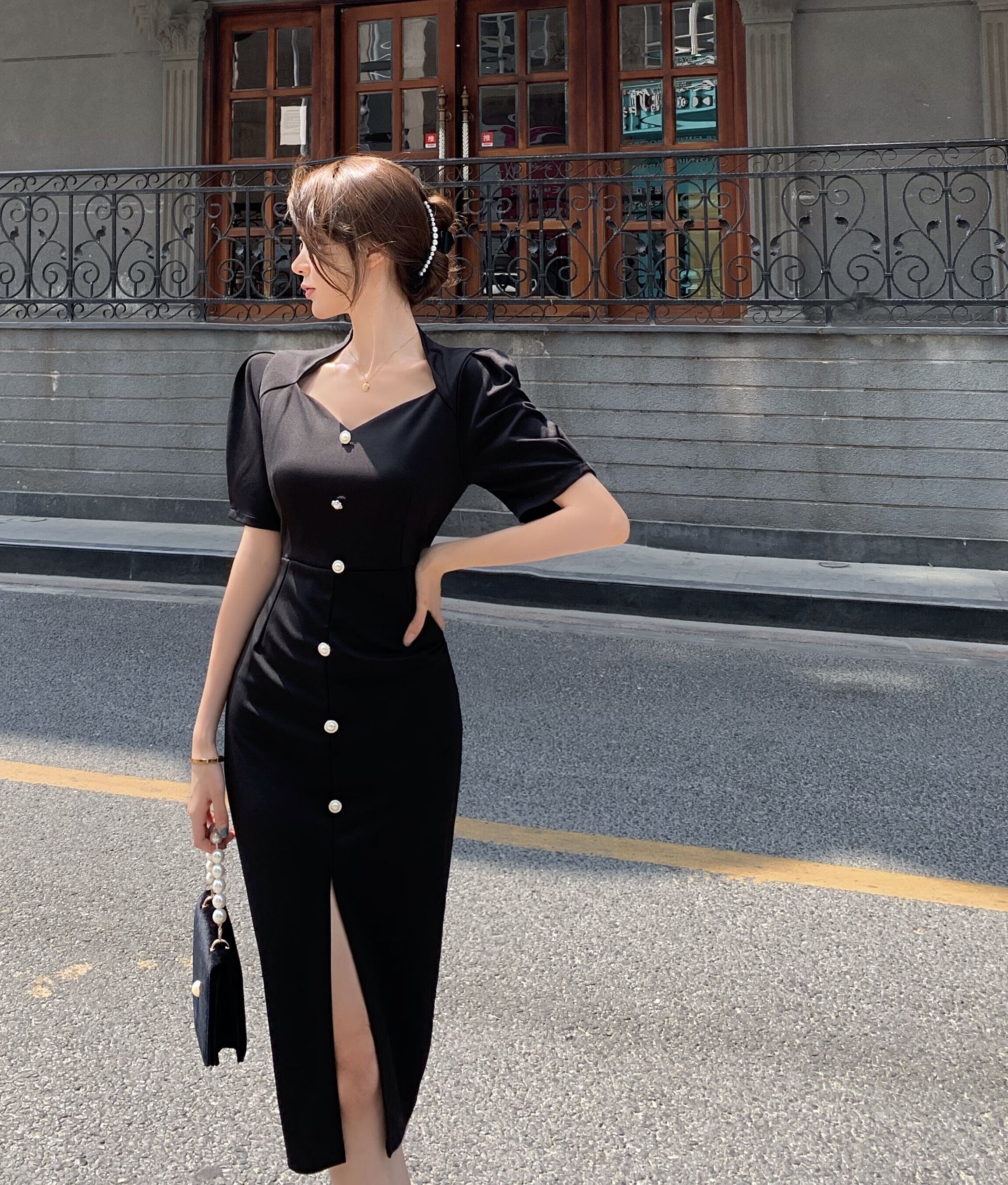 フランスのレトロな冷風女性のハイエンドの小さな黒いドレスウエストスリム気質女性スプリットドレス女性の夏 ブラック サマー 夏物 yingd4988546159