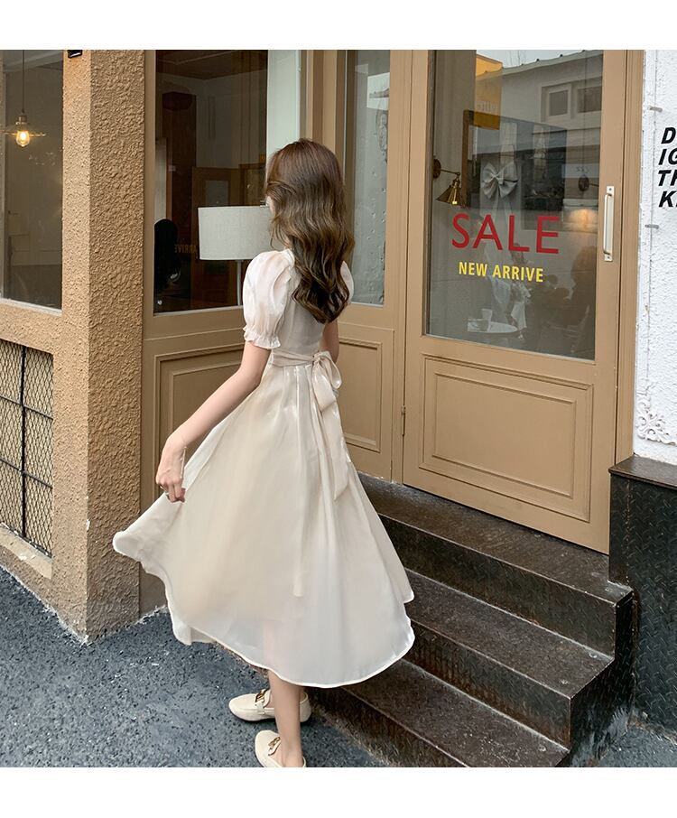 スカートの女性の2021年夏の新しいフランスのレトロな冷たい風のハイエンドの正方形の襟のパフスリーブ明るいシルクのドレスの女性 サマー 夏物 スクウェア yingd47342441560