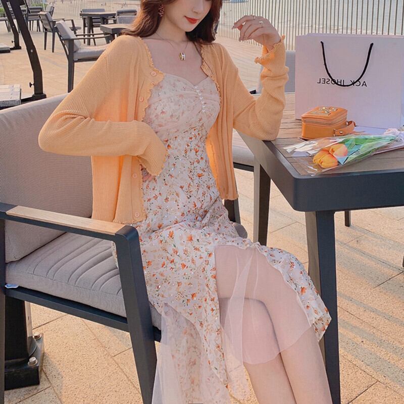 フランスのレトロなベルフラワーティーブレイク壊れた花の妖精のスカートのウエストと薄い気質壊れた花のスリングフィッシュテールドレス女性の夏 サマー 夏物 フラワーデザイン yingd68539694755