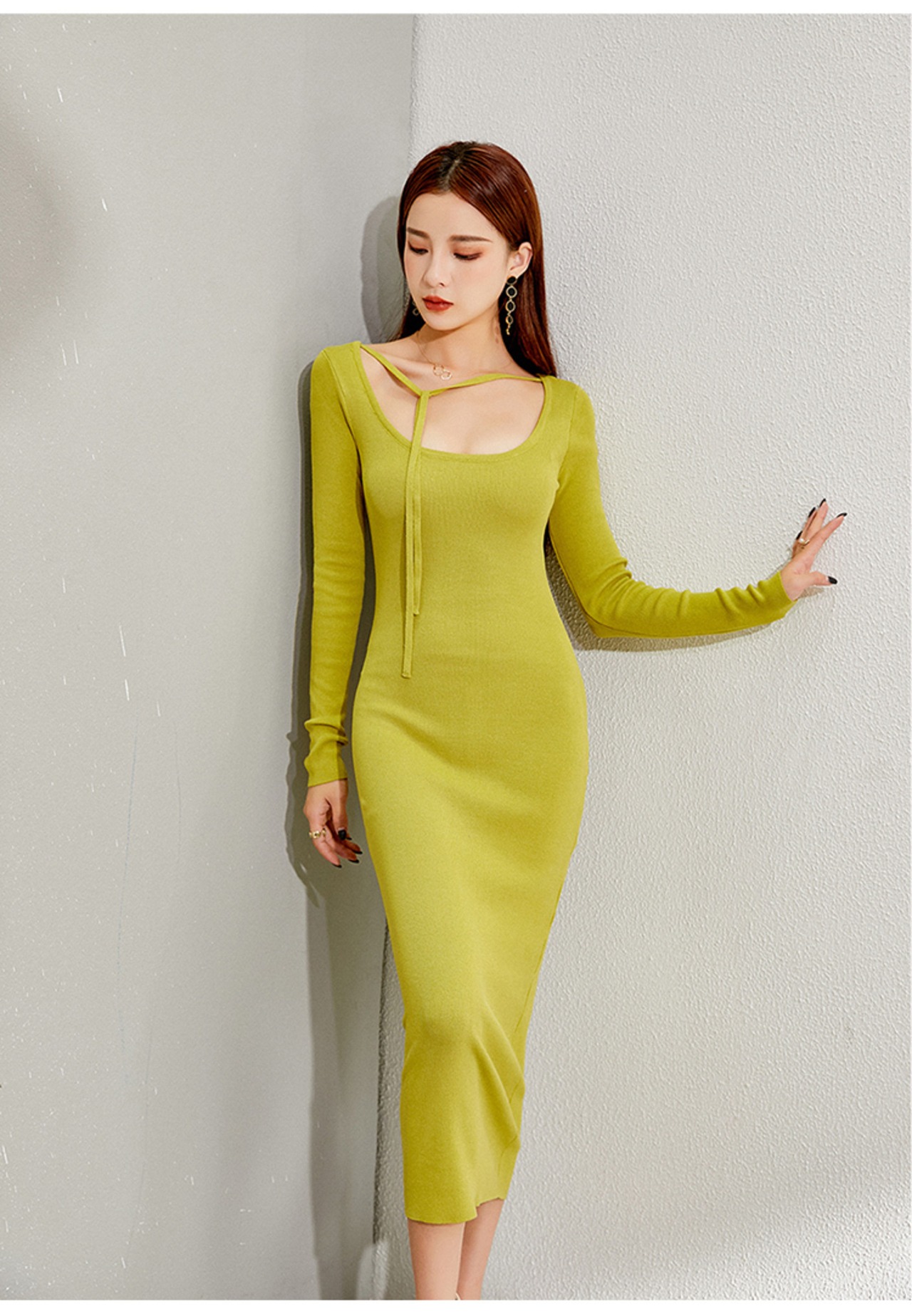 フレンチレトロロング膝上セータードレスセクシー注意マシンタイトフィットバッグヒップインナーニットドレス女性秋冬 オータム 秋物 ウィンター 冬物 yingd30927417086