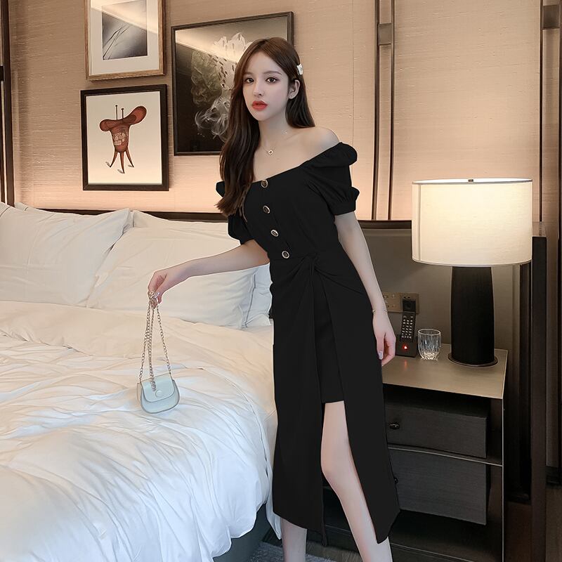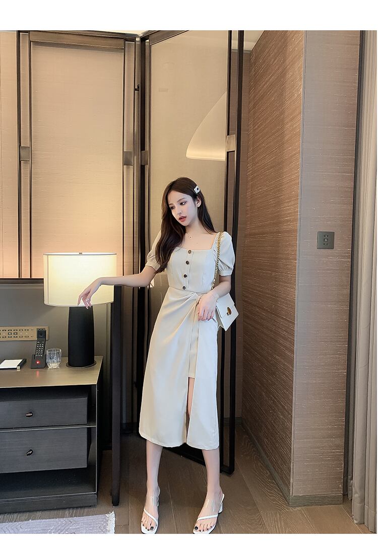サマードレス2022新しいフレンチレトロスクエアネックパフスリーブスリットドレス女性ウエストスリム気質女神ファン 夏物 スクウェア yingd62558962806