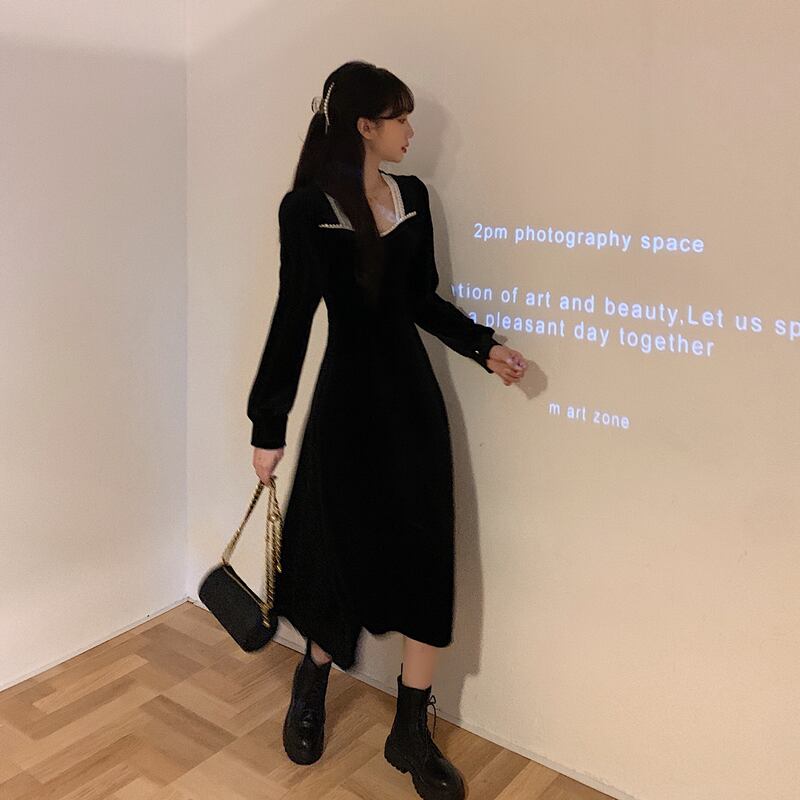 ロングスカートは薄くて気性のあるライトラグジュアリーデザインのスカートライトおなじみのスタイルスクエアネックパフスリーブベルベットドレス秋冬 オータム 秋物 ウィンター 冬物 スクウェア yingd9821817250
