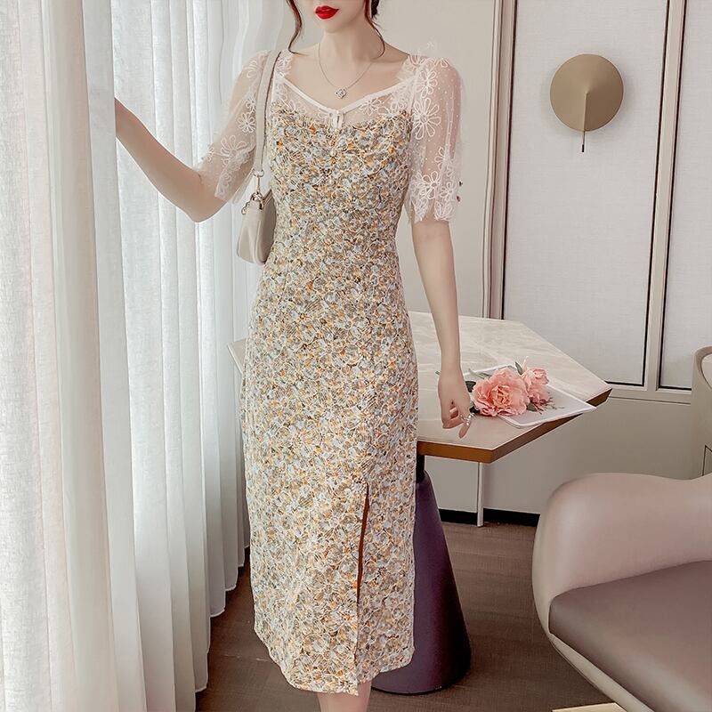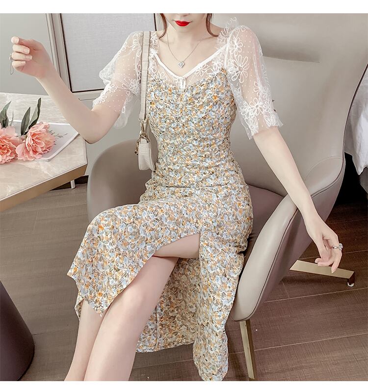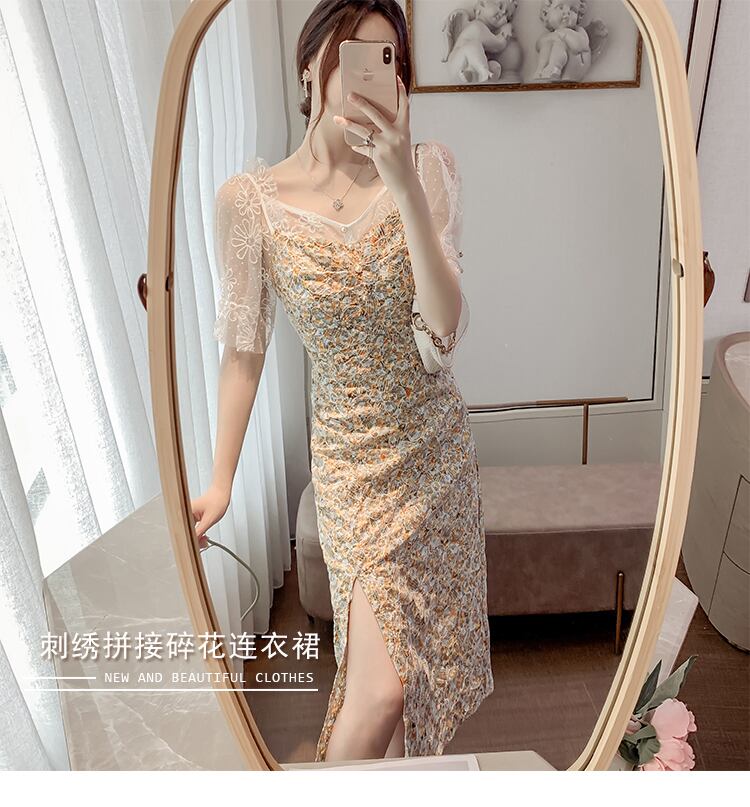 フランスの優しいスタイルのティーブレイクベルフラワースカートウエストスリム気質メッシュ妖精スーパーフェアリーエストドレス女性の夏 サマー 夏物 フラワーデザイン yingd26387134553