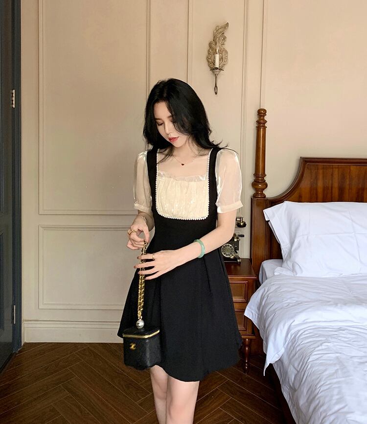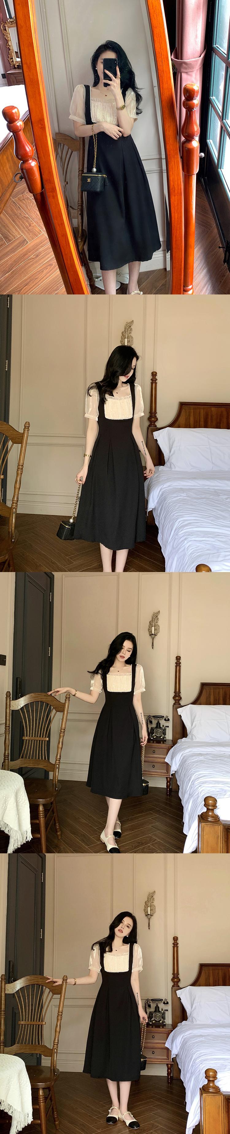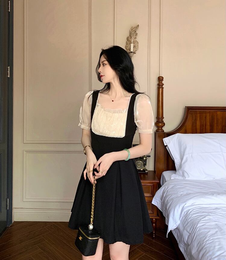 フレンチレトロヘップバーンスタイルリトルブラックドレスロイヤルシスターライトおなじみスタイルデザインセンスステッチパフスリーブスクエアカラードレス女性夏 サマー 夏物 スクウェア yingd79184396910