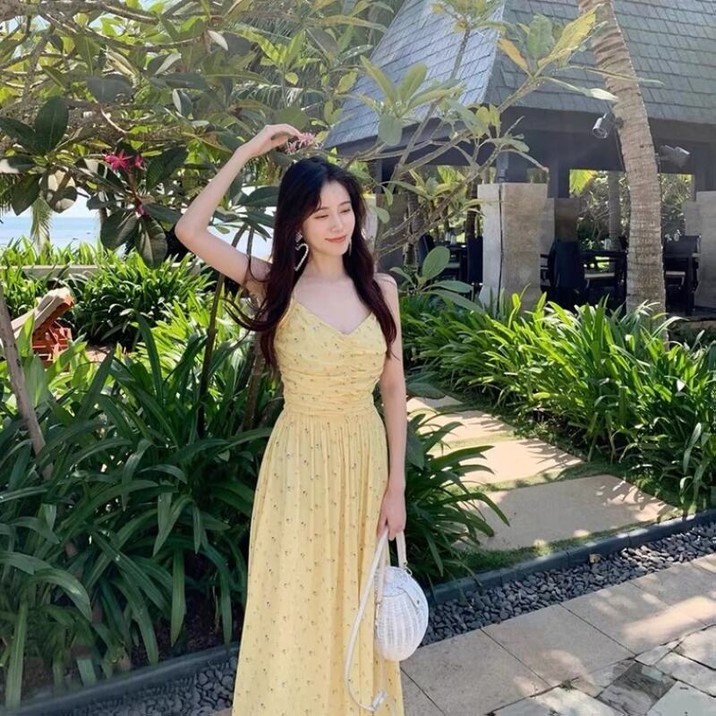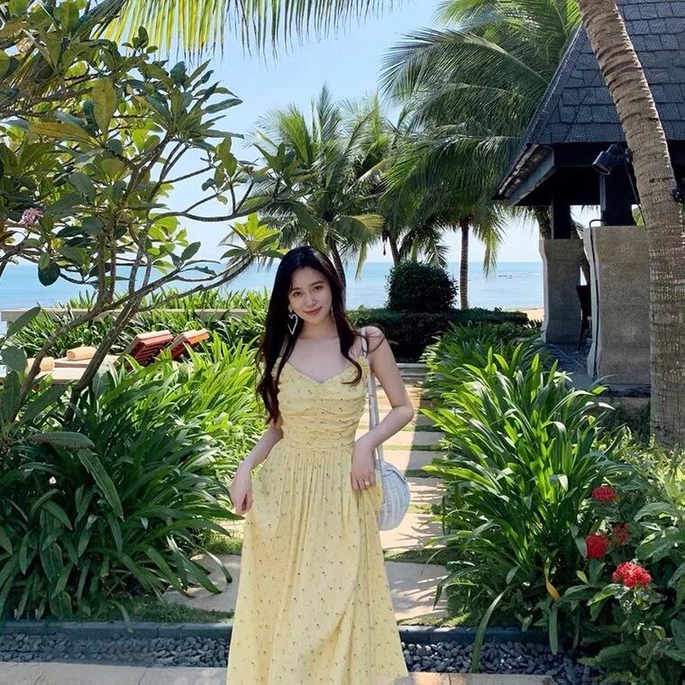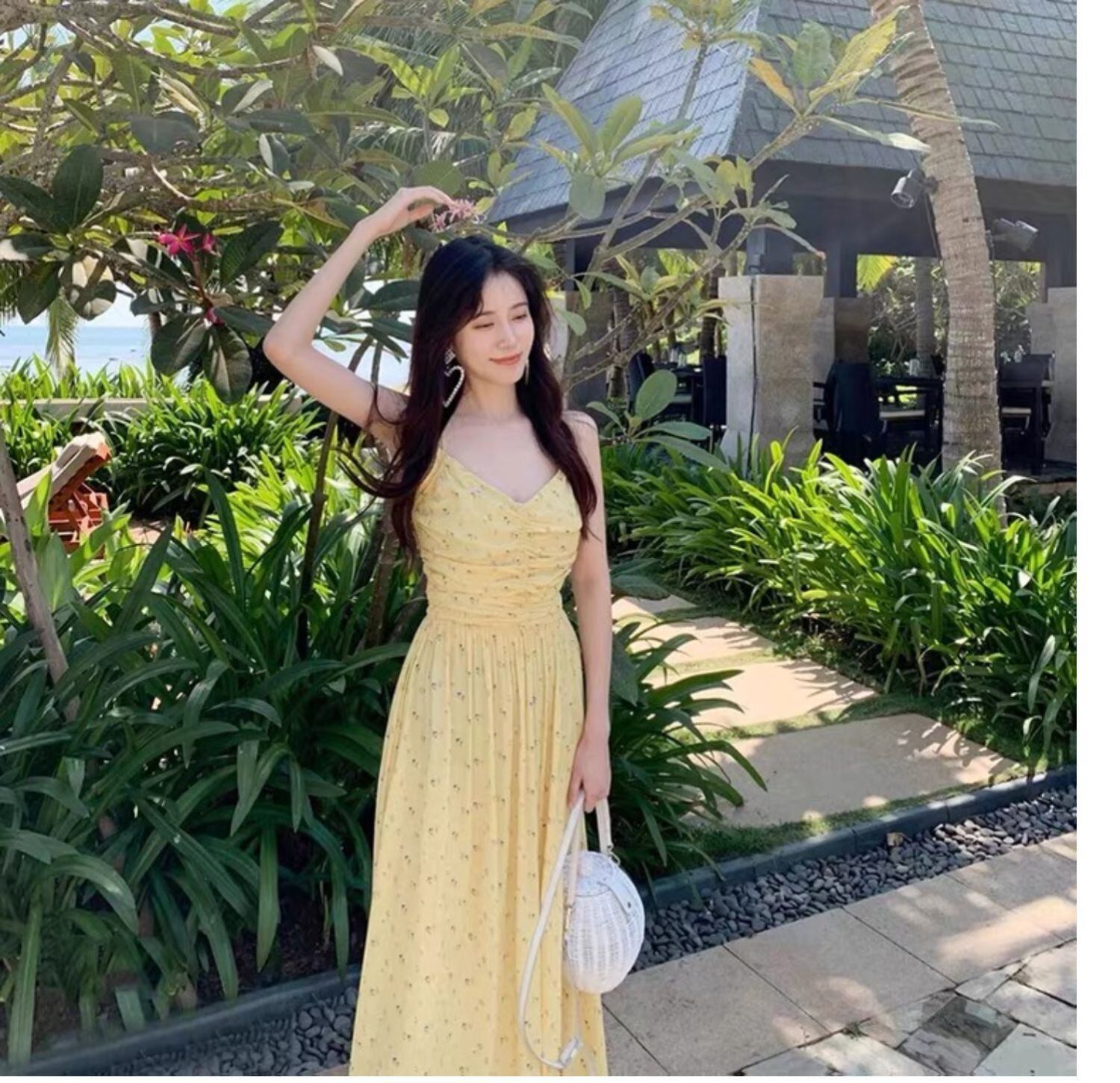 フランスのレトロなフローラルサスペンダードレスウエスト穏やかな風は塩辛い甘い黄色の花のサスペンダードレス女性の夏にすることができます 大人ガーリー スウィート キュート カジュアル サマー 夏物 花柄 yingd21884214681