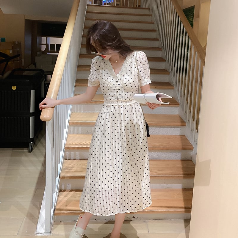 フレンチニッチスウィートファーストラブフェアリースカートデザインセンスライトラグジュアリーレディ気質Vネック水玉ドレス女性夏 大人ガーリー キュート カジュアル サマー 夏物 yingd20484704388