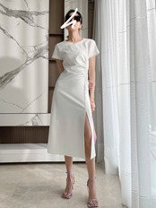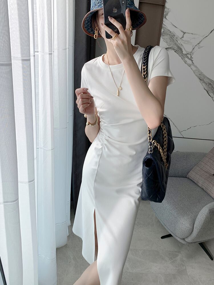 フレンチレトロウエストスリム気質スモールスカートデザインプリーツゆじえライトおなじみスタイルスプリットドレス女性夏 サマー 夏物 yingd98379056627
