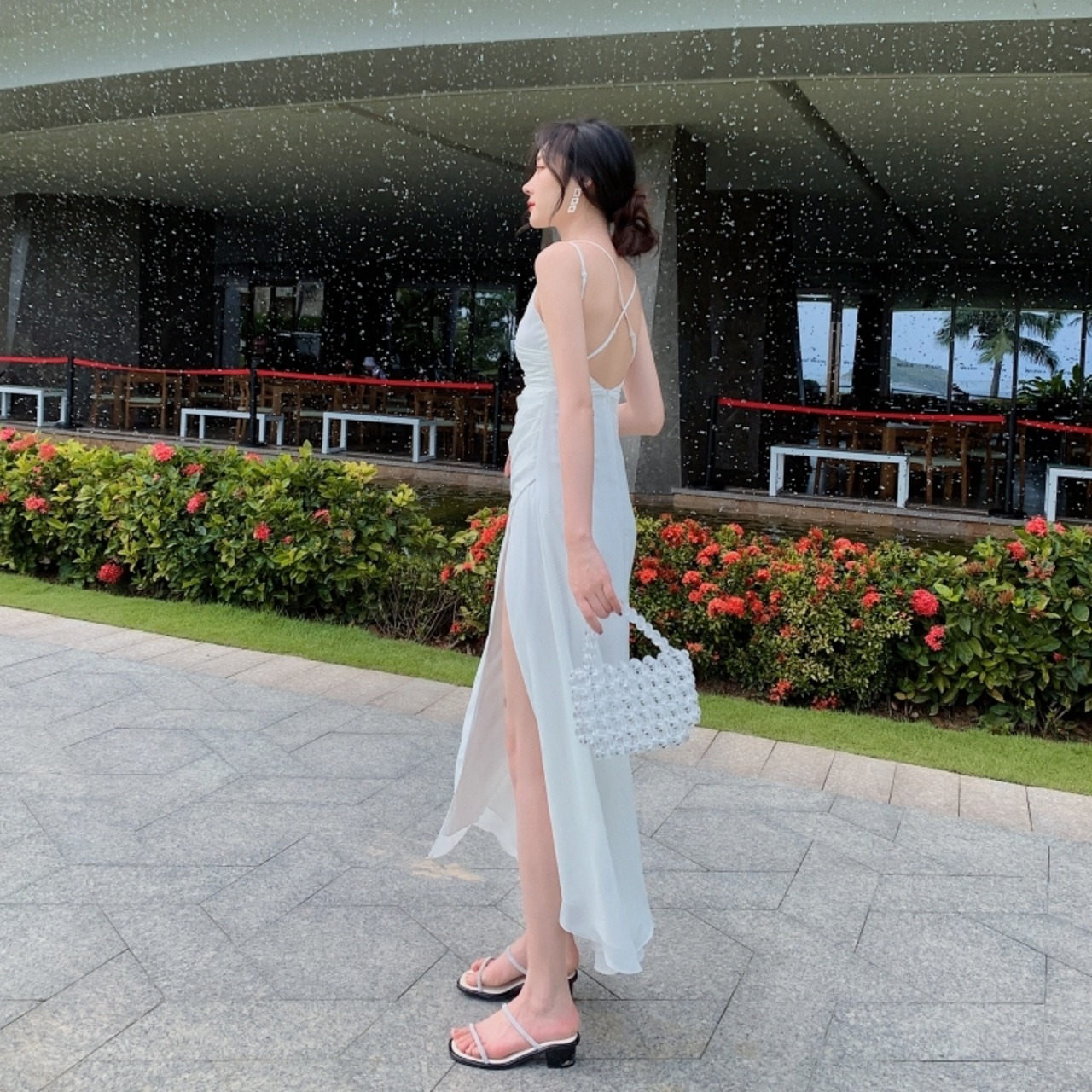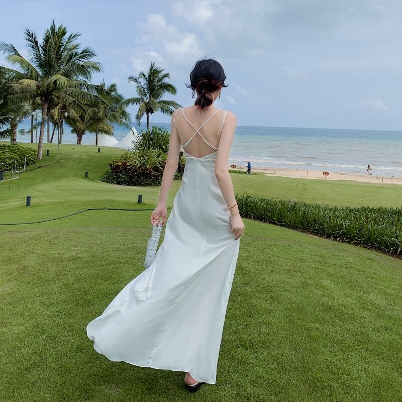 フランスのレトロなスーパーフェアリーエスト初恋スカート優しいスタイル気質ロングスカートセクシーな背中の開いたサスペンダードレス女性の夏 サマー 夏物 yingd83930405989