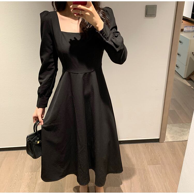 レトロなヘップバーンスタイルのリトルブラックドレスウエストスリム気質スクエアカラーフレンチニッチティーブレイク長袖ドレス女性の秋と冬 ロング オータム 秋物 ウィンター 冬物 スクウェア yingd96380430085