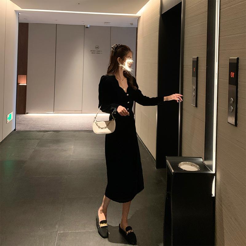 フレンチレトロヘップバーンスタイルリトルブラックドレス毎年恒例のミーティングドレス秋と冬の気質ライトラグジュアリーレディースベルベットドレス女性の冬のスカート オータム 秋物 ウィンター 冬物 yingd77235866247