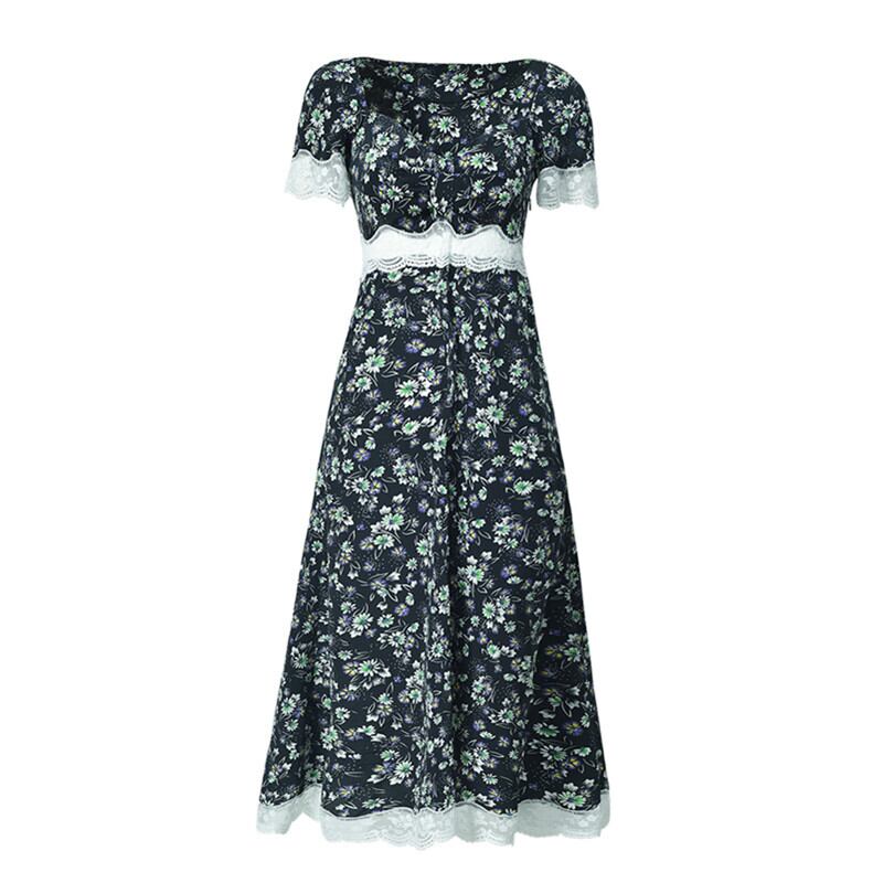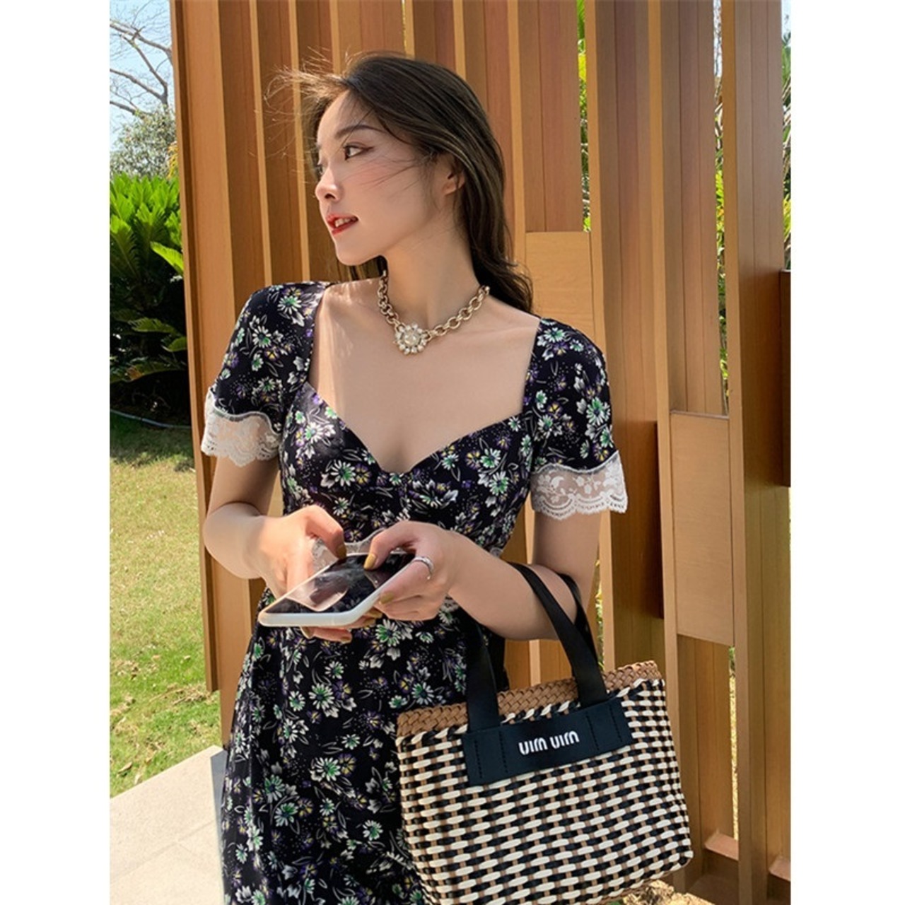 フランスのレトロな優しいスタイルのティーブレイクベルフラワースカート冷風ハイエンドレースエッジVネックフローラルドレス女性の夏 サマー 夏物 花柄 フラワーデザイン yingd50021170709