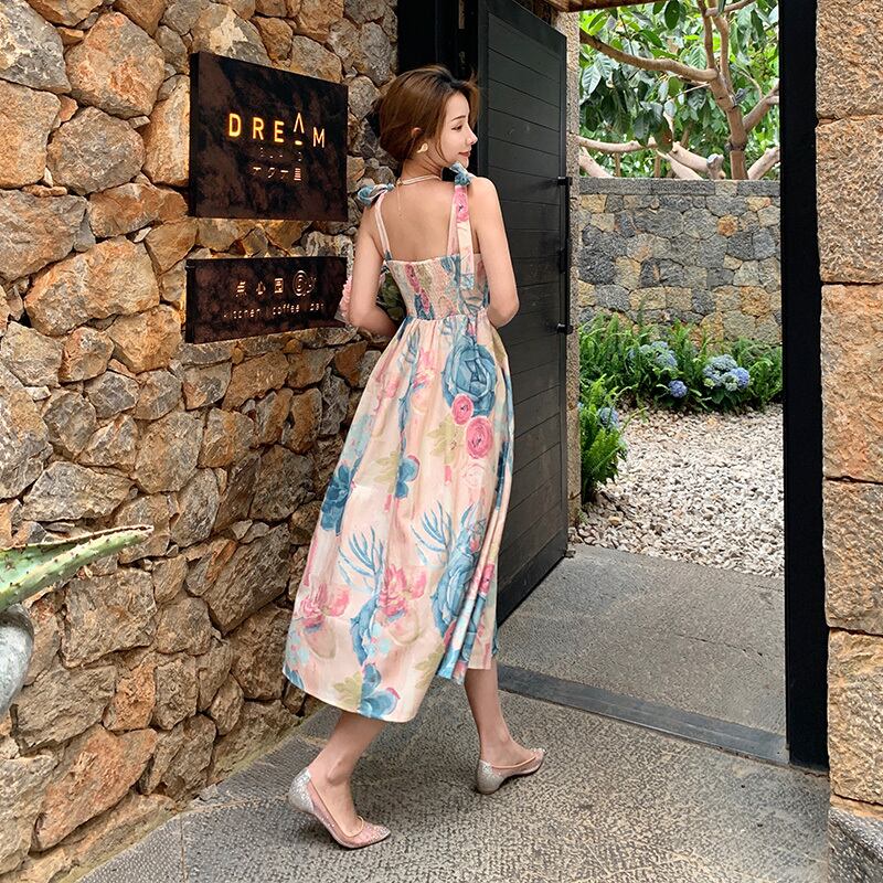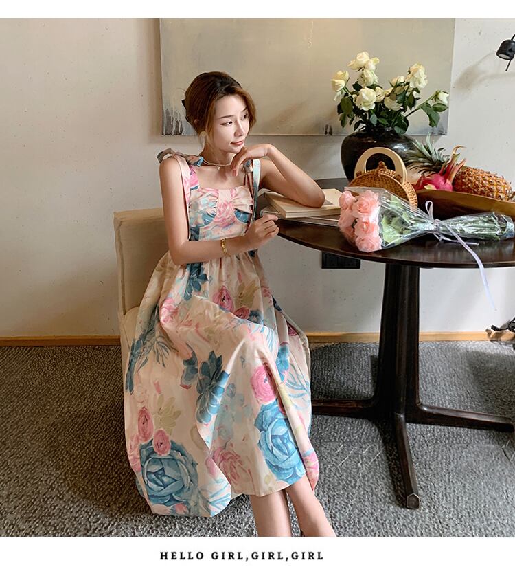 フランスのレトロな優しいスタイルのベルフラワーティーブレイクフローラルロングドレスウエストスリム気質フローラルサスペンダードレス女性の夏 サマー 夏物 花柄 フラワーデザイン yingd66027839548