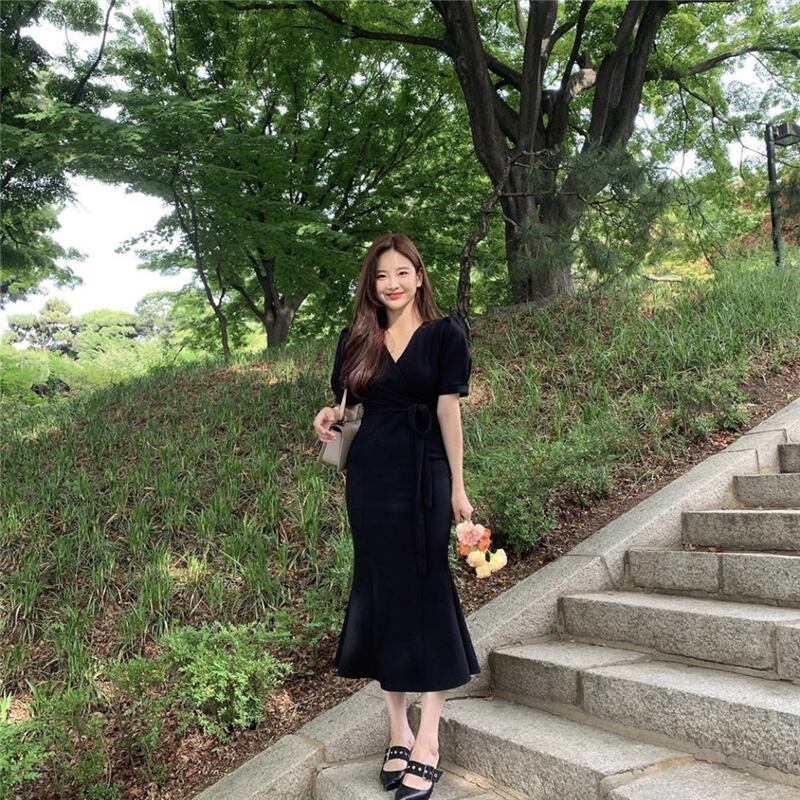 フランスのレトロなヘップバーンスタイルのロングドレス夏の慎重なマシンセクシーなVネックスリムバッグヒップライトおなじみのスタイルフィッシュテールドレス女性 サマー 夏物 yingd30014039373