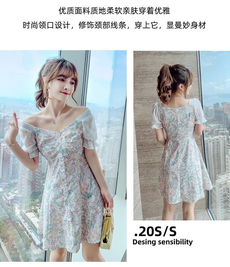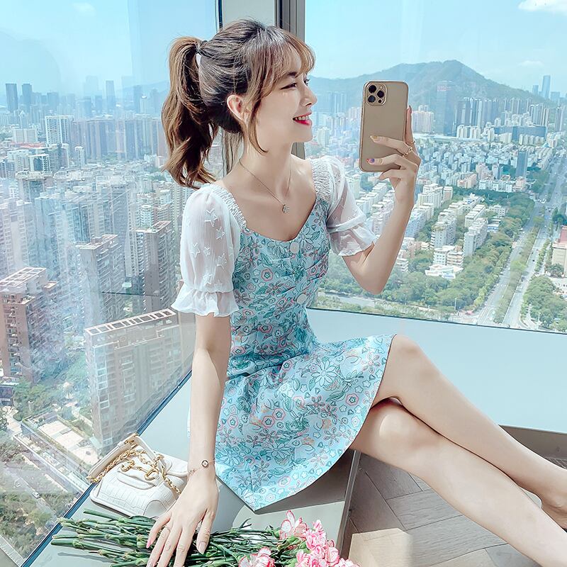フランスのレトロな優しいスタイルのティーブレイクベルフラワースカートスクエアネックパフスリーブ小さな花柄のyドレス女性の夏 サマー 夏物 フラワーデザイン スクウェア yingd15686099000