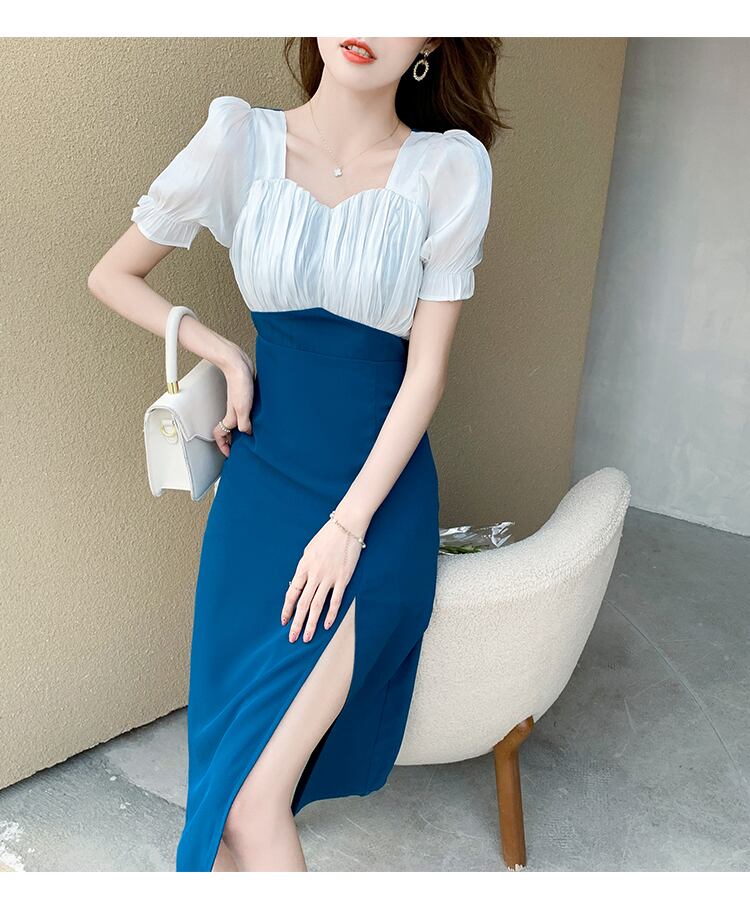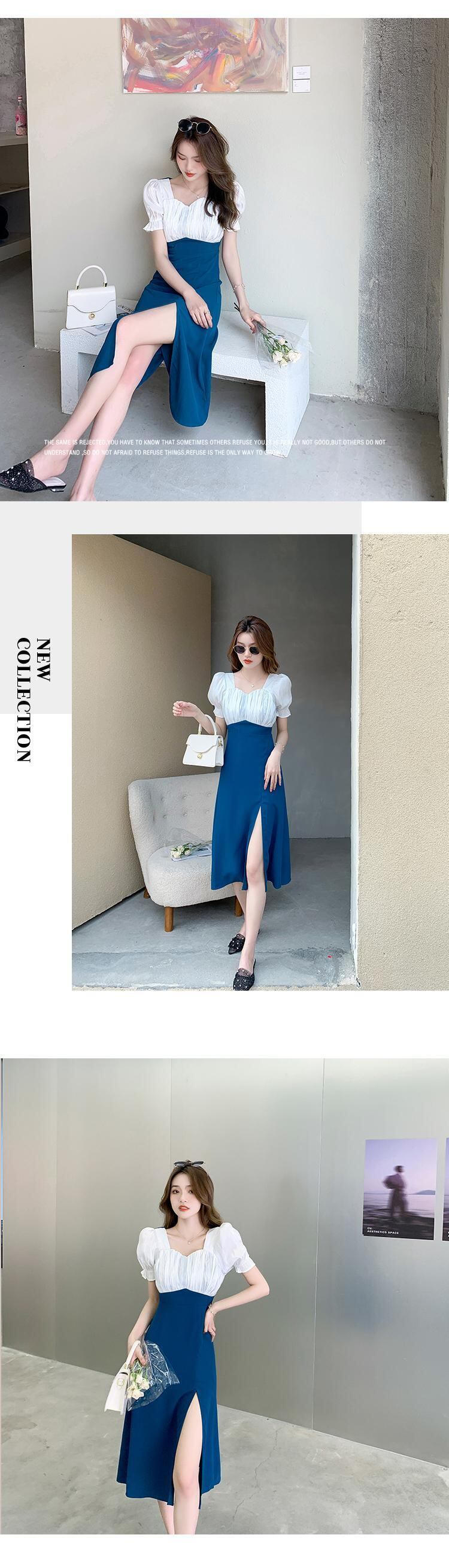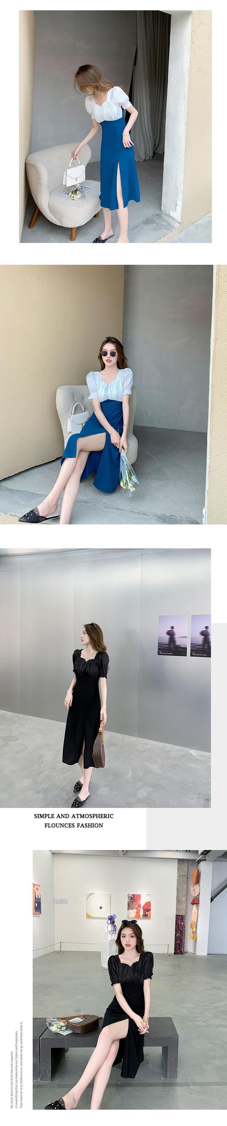 フランスのレトロな優しいスタイルの気質小さなスカートセクシーなスプリットスクエアネックパフスリーブシフォンステッチドレス女性の夏 サマー 夏物 スクウェア yingd72709707266