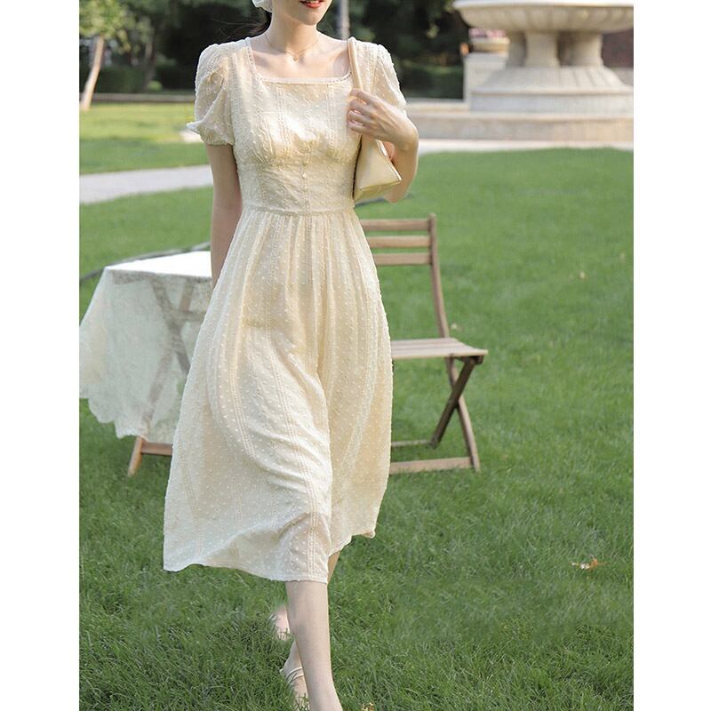 フレンチレトロスウィートファーストラブフェアリースカート優しいスタイル気質スモールスカートスクエアネックパフスリーブドレスサマーウエスト 大人ガーリー キュート カジュアル 夏物 スクウェア yingd44672894508