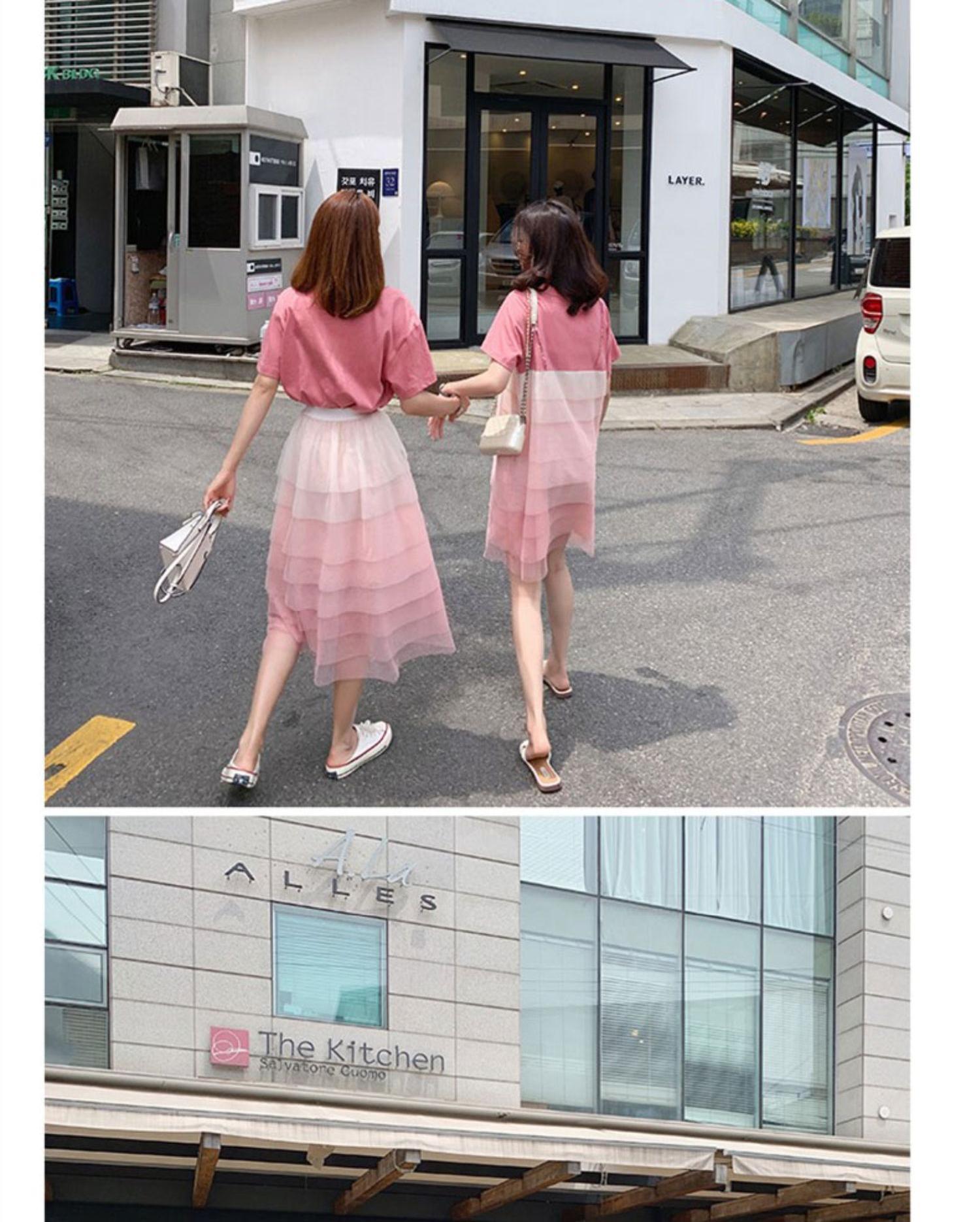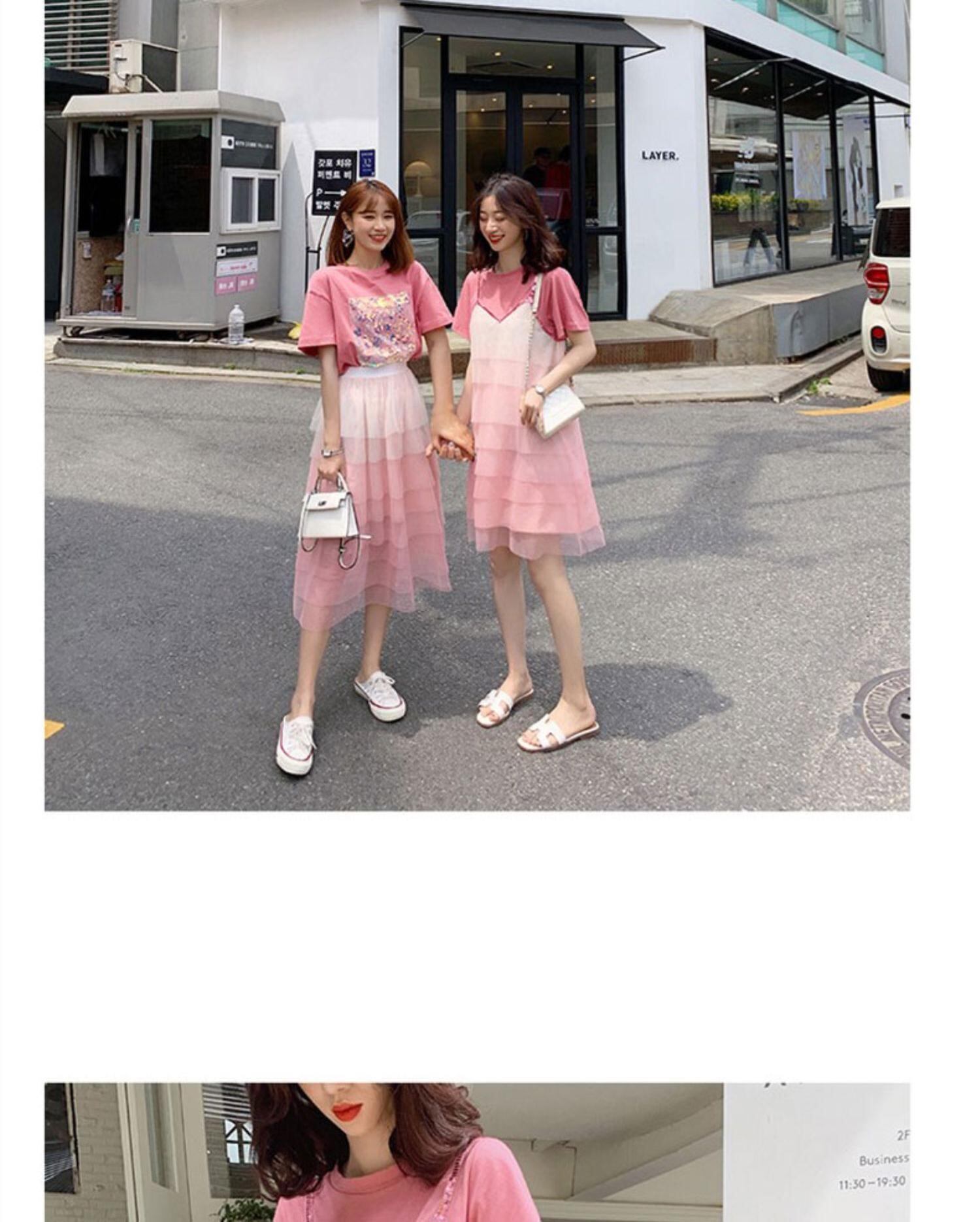 色:ピンクTシャツ+スカート(先行販売),ピンクのTシャツフェイクツーピースドレス