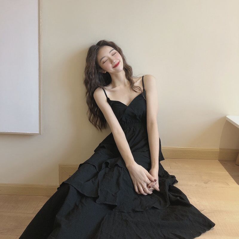 フレンチレトロブラックサスペンダードレスレディースサマードレスウエストスリミング気質デザインスモールアウターウェアサスペンダースカート 夏物 yingd34445055289