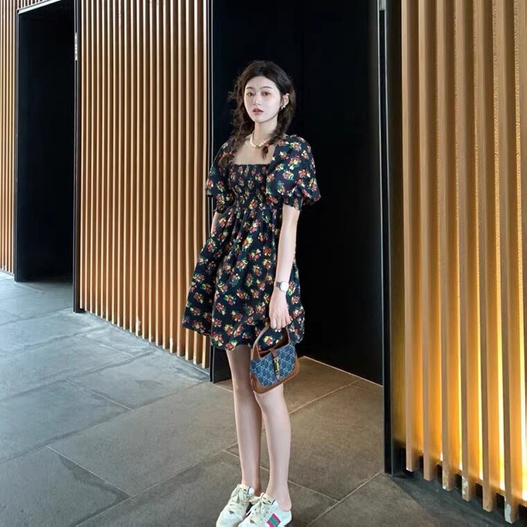 ウエスト感と気質の薄いフレンチレトロベルフラワーティーブレイクスカートフローラルスクエアネックパフスリーブワンピース女性夏 サマー 夏物 花柄 フラワーデザイン スクウェア yingd24560653779