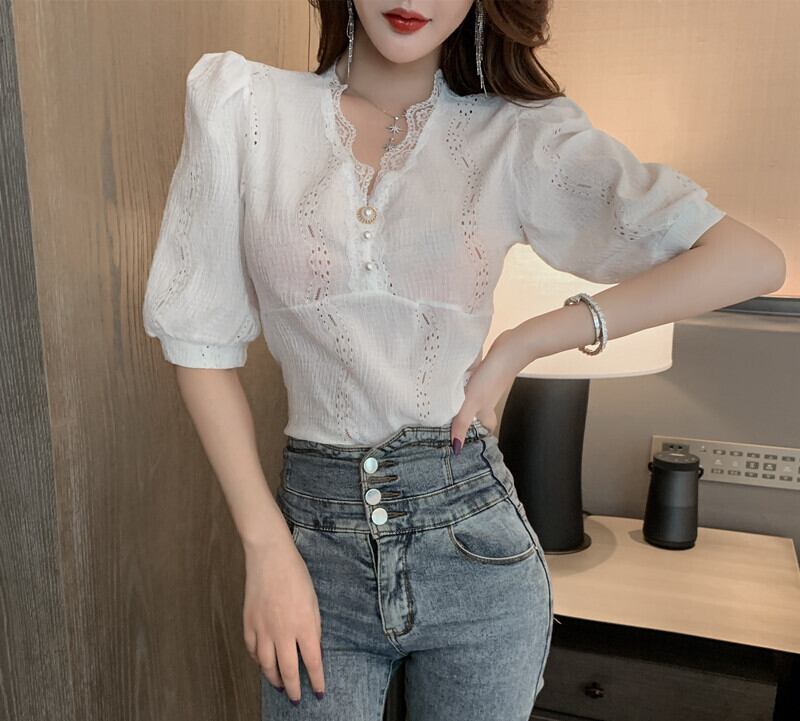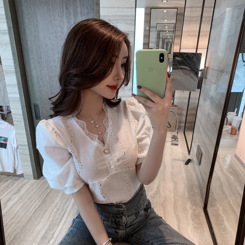 2020サマードレス新しいレトロな香港風味のパフスリーブシャツ女性のデザインセンスニッチVネックレースレーストップ女性 レッド 夏物 yingd78782573860