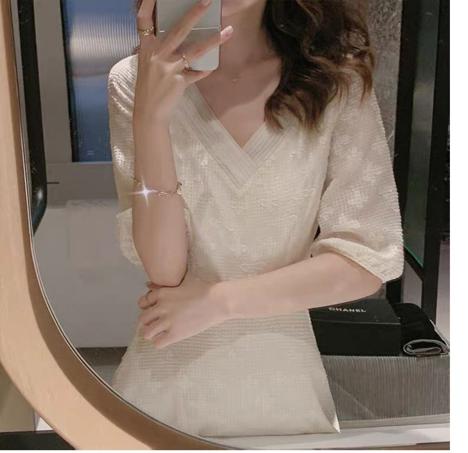 フランスのレトロなニッチベルフラワースカートライトラグジュアリーデザインスカートフェアリーエストパフスリーブ白いドレス女性の夏 ホワイト サマー 夏物 フラワーデザイン yingd49312853710