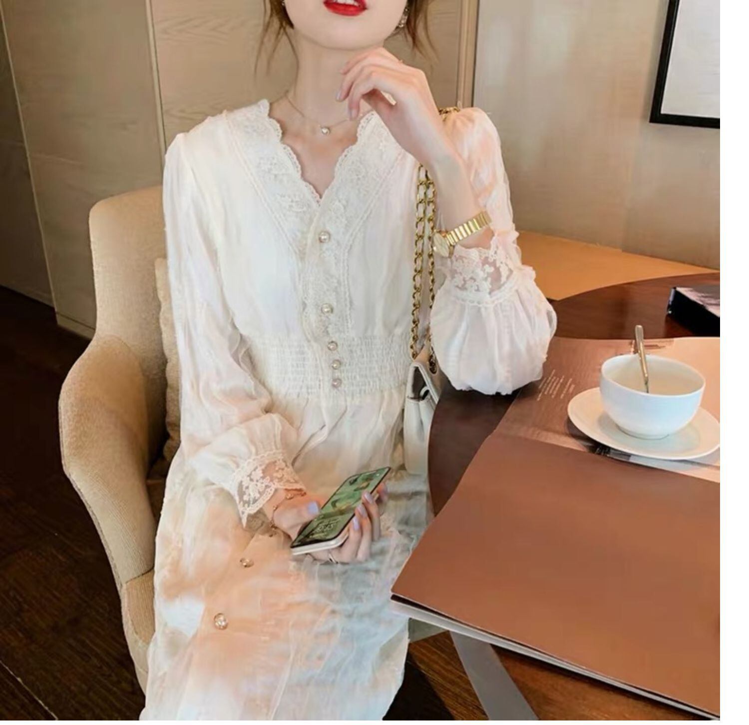 フレンチレトロロングドレスは薄くて上質なライトラグジュアリーデザインのスカート長袖レースドレスレディース秋冬 オータム 秋物 ウィンター 冬物 yingd48037310596