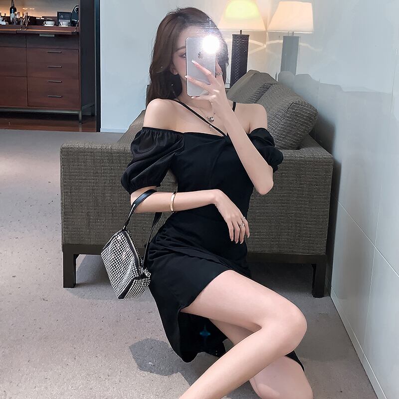 フレンチレトロデザインセンスのニッチ気質スモールスカートイレギュラーパフスリーブワンワードカラーホルタードレス女性夏 サマー 夏物 yingd78127294485