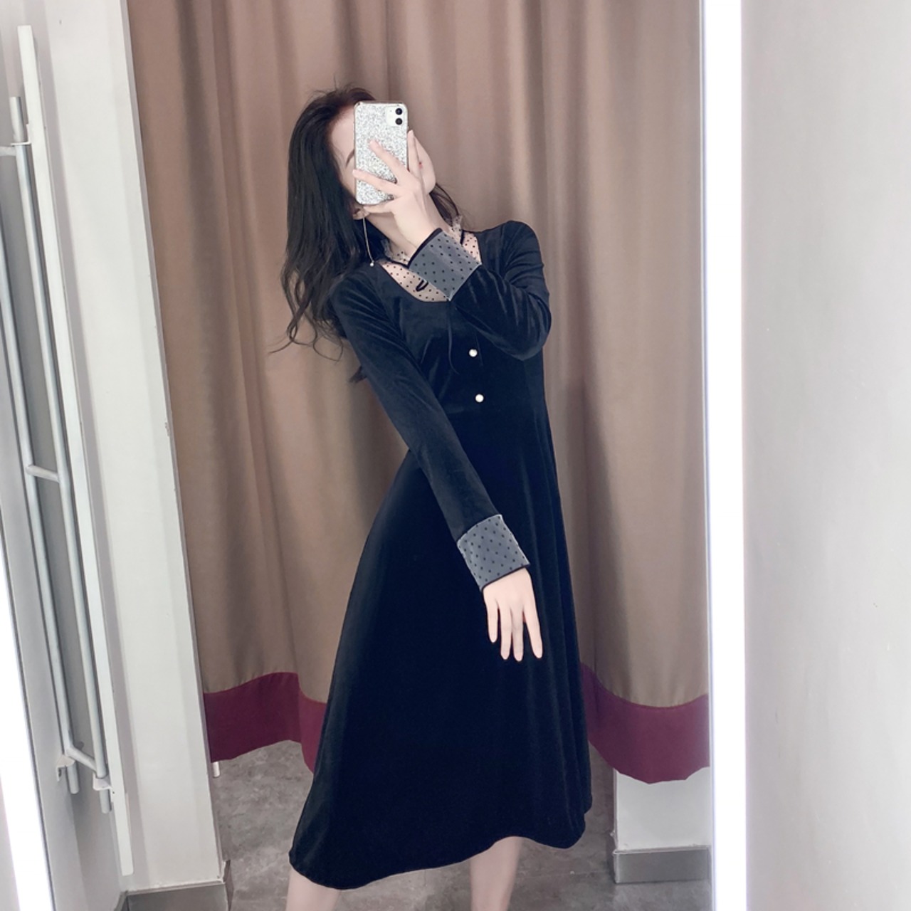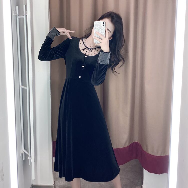 フレンチレトロロイヤルシスターライトおなじみスタイル気質ウエストは薄めヘップバーンスタイルリトルブラックドレス長袖ベルベットドレスレディース秋 ロング オータム 秋物 yingd51290313701